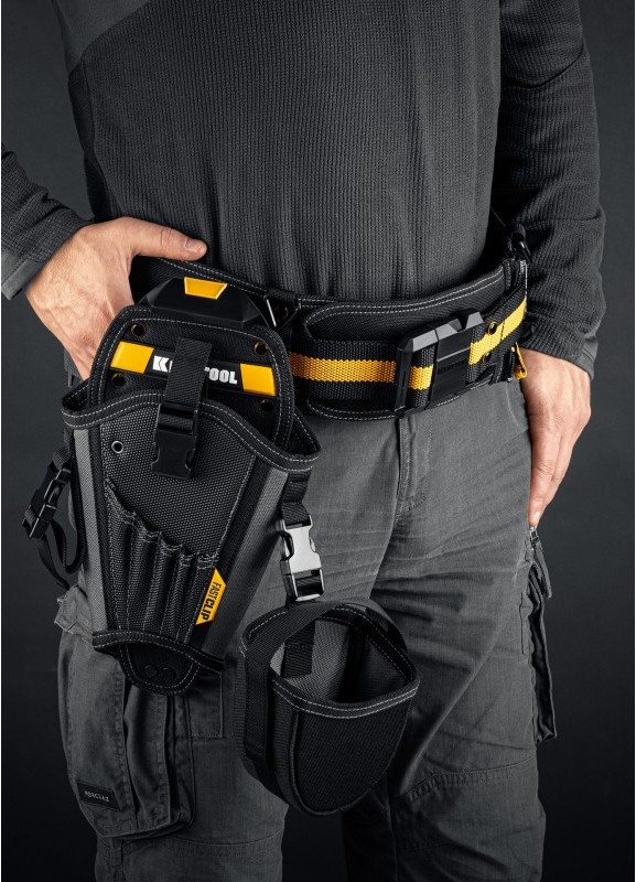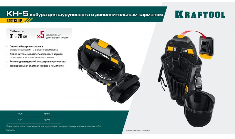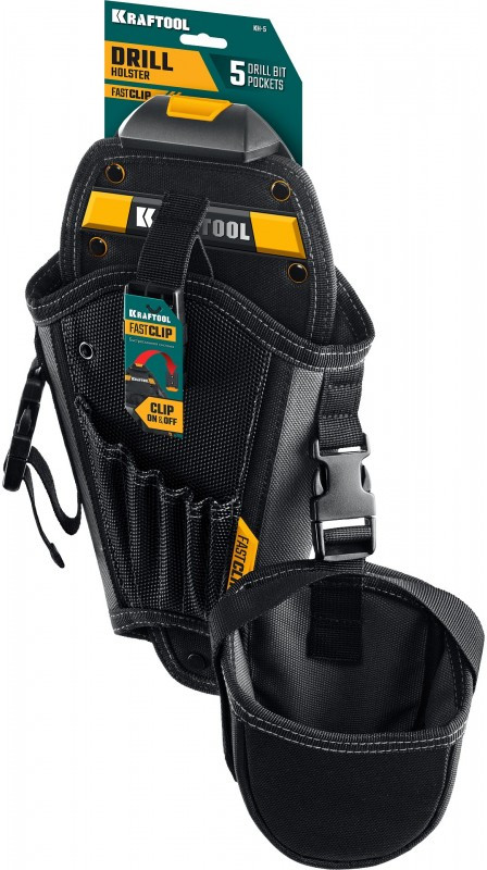 Кобура для шуруповерта KRAFTOOL KH-5 с дополнительным съёмным карманом, с быстросъёмным креплением FastClip, 5 отделений для свёрл и бит [38769]
