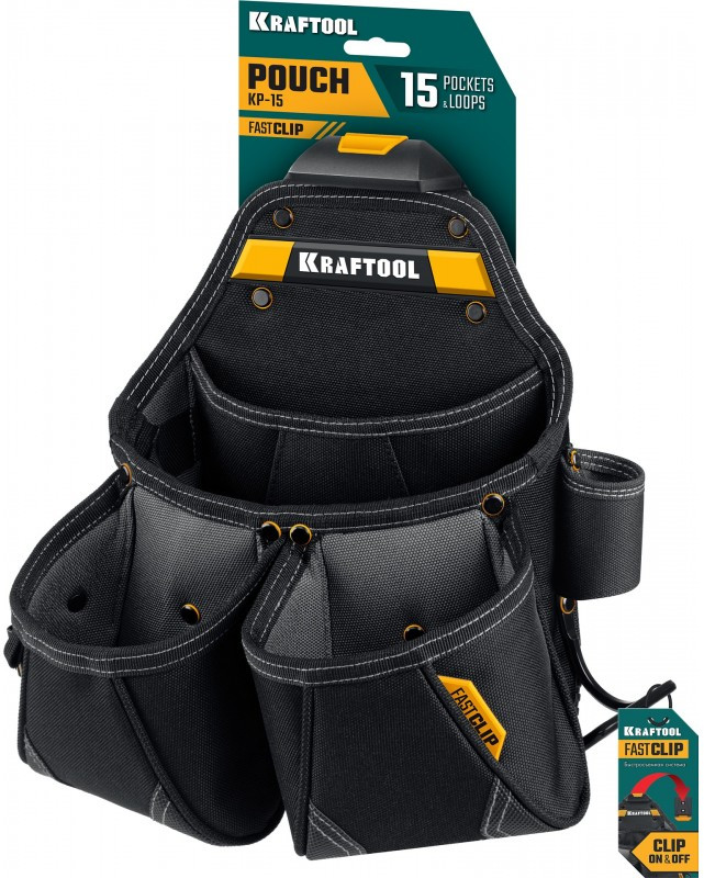 поясная сумка KRAFTOOL KP-15 с быстросъёмным креплением FastClip, 15 карманов и петель, 350 х 320 мм [38771]