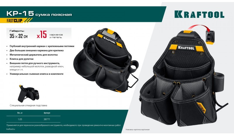 Профессиональные пояса и сумки KRAFTOOL KRAFTBUILT с системой быстросъёмного крепежа предлагают уникальную возможность организации рабочего процесса. Используйте только только тот инструмент, который нужен именно сейчас.