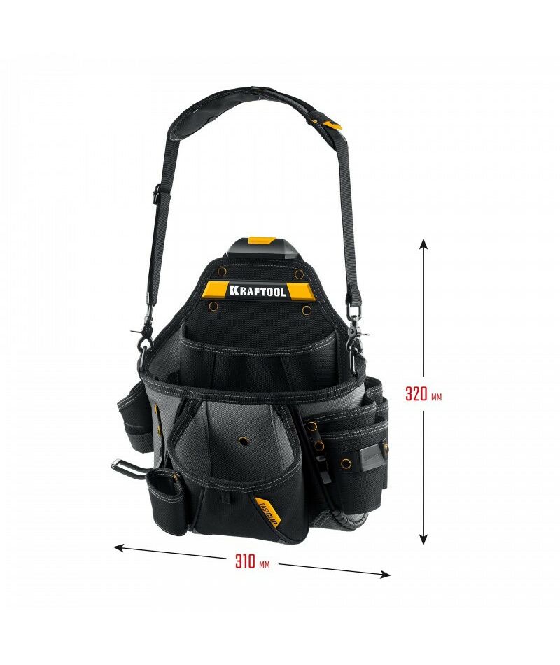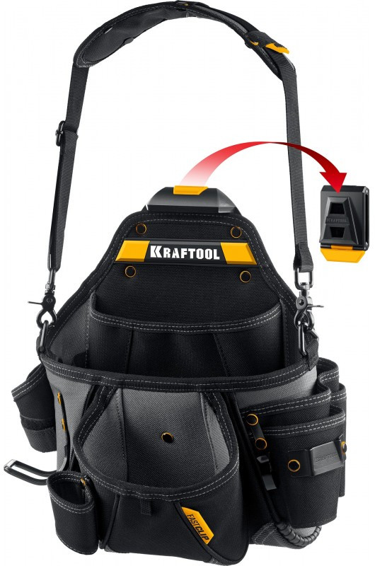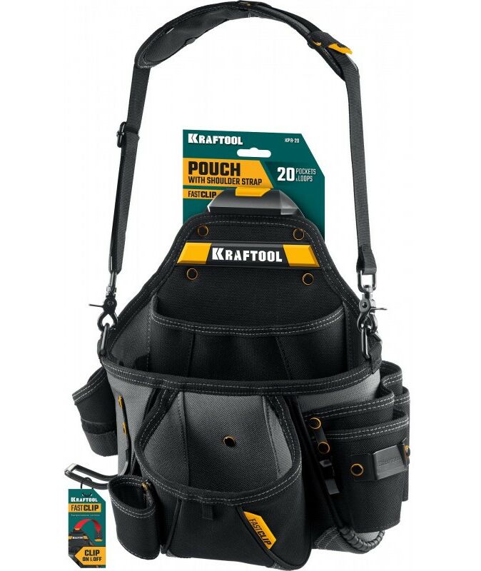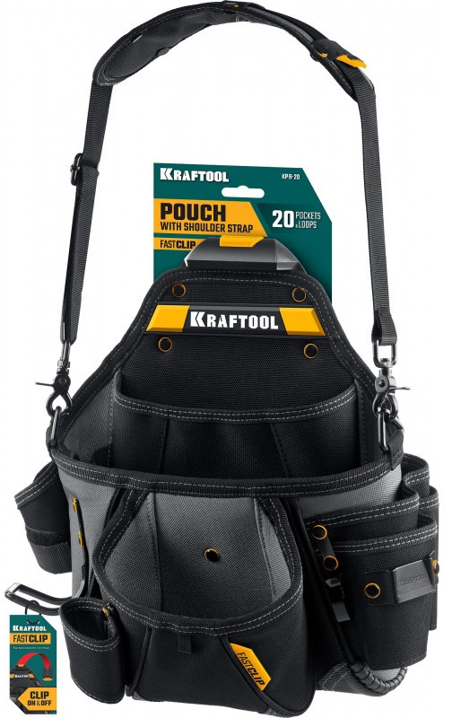Поясная сумка KRAFTOOL KPB-20 с быстросъёмным креплением FastClip, плечевой ремень, 20 карманов и петель, 320 х 310 мм [38767]
