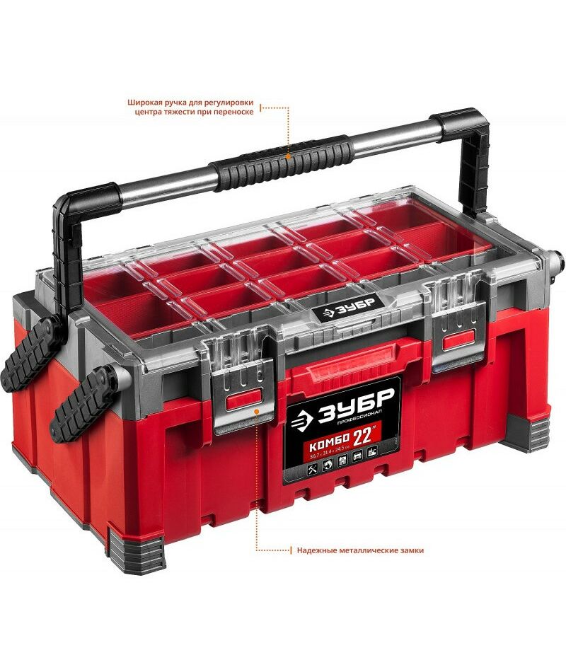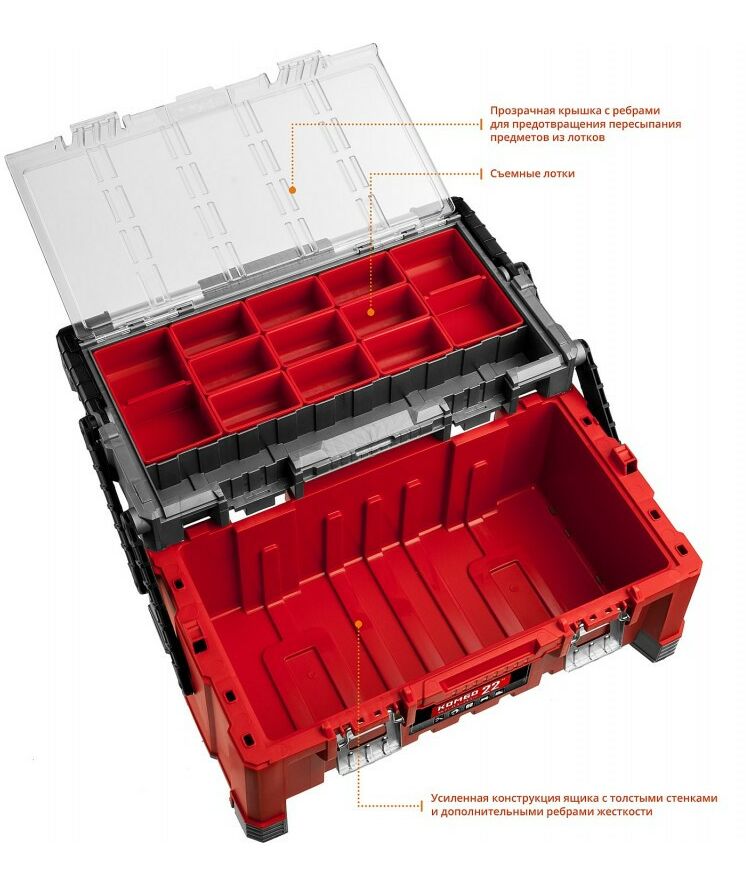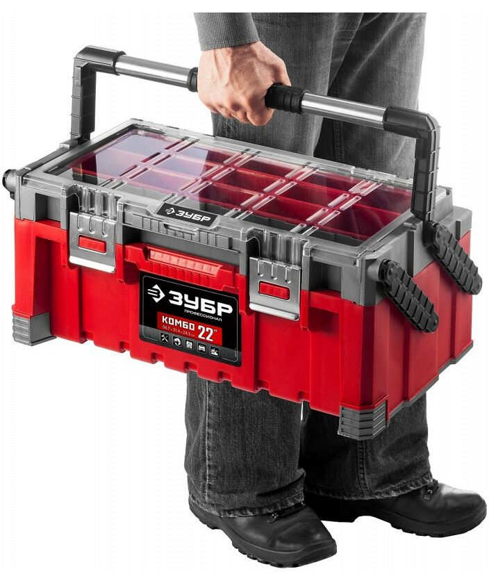 - Широкая металлическая ручка для регулировки центра тяжести ящика при переноске.