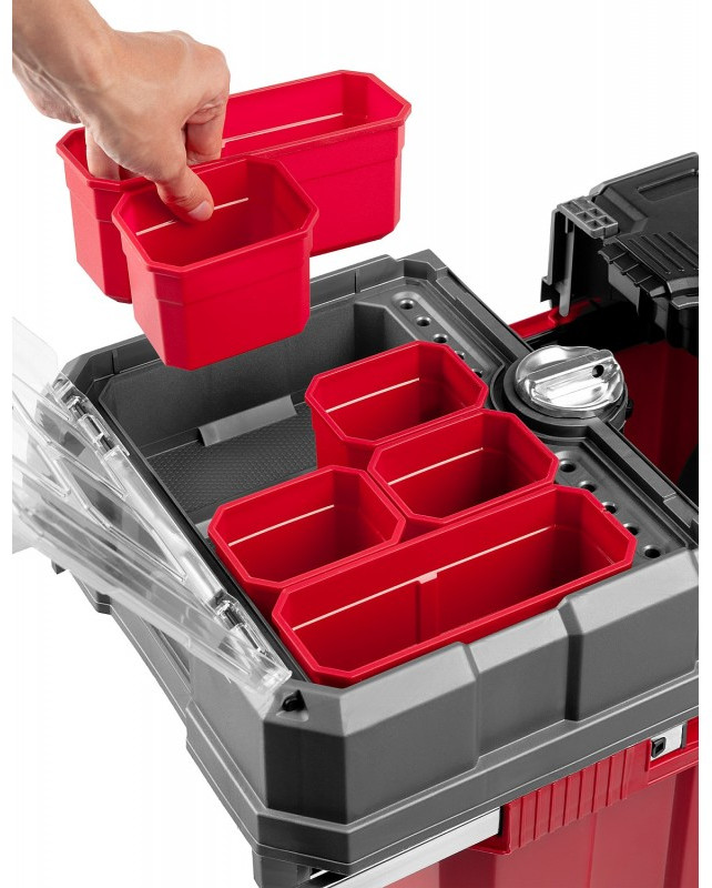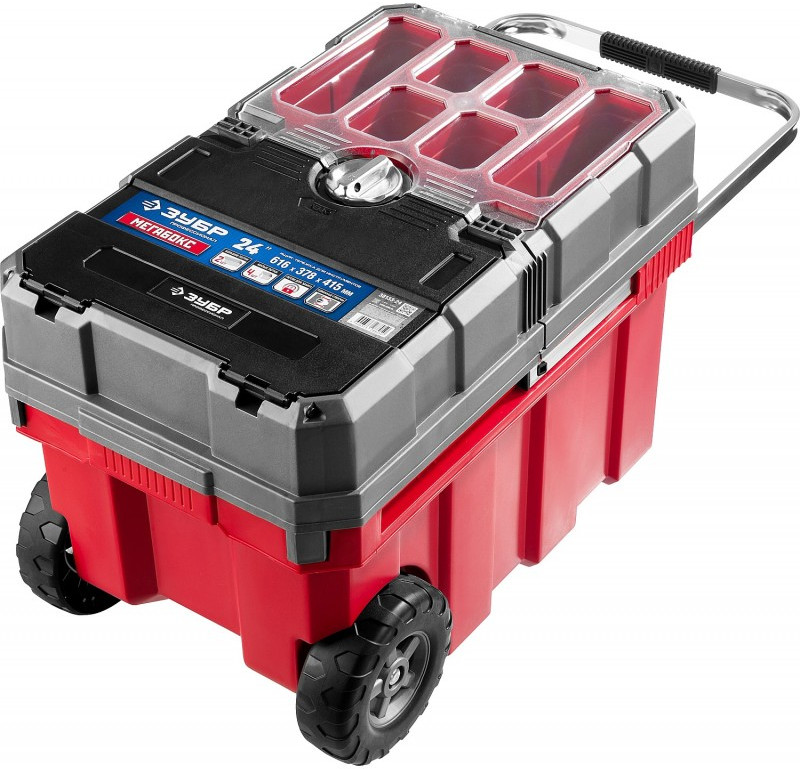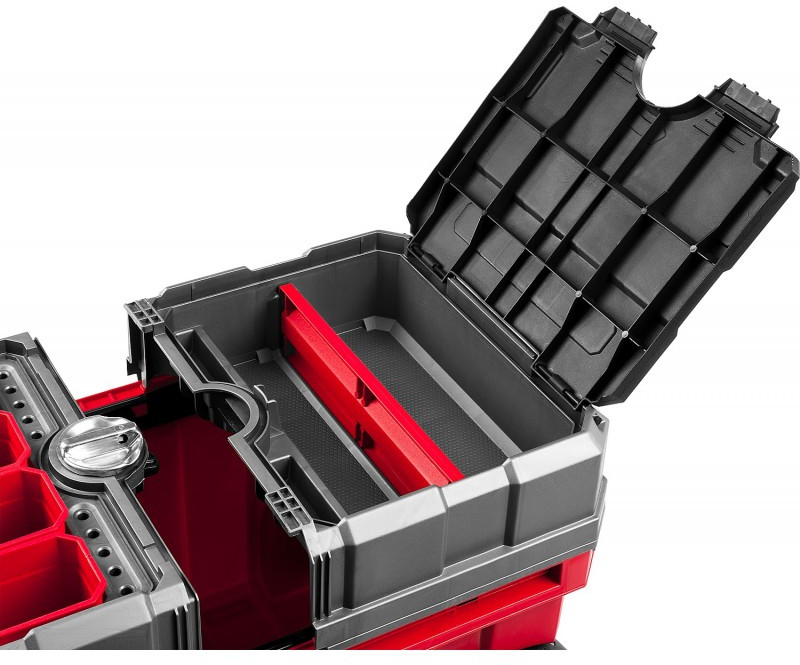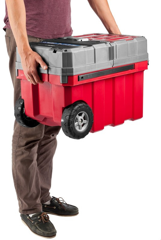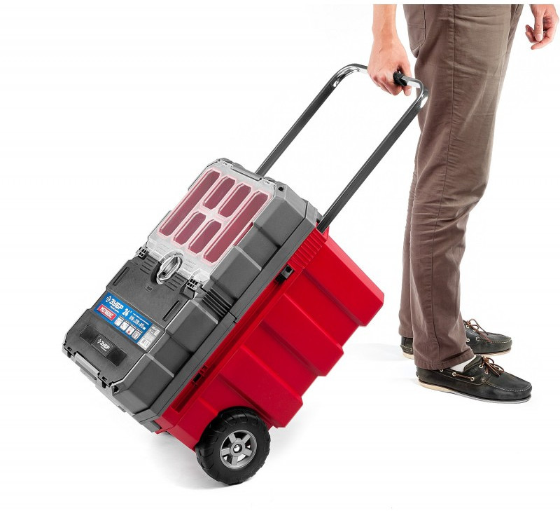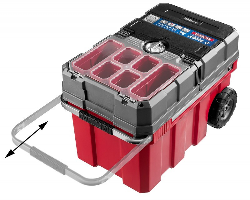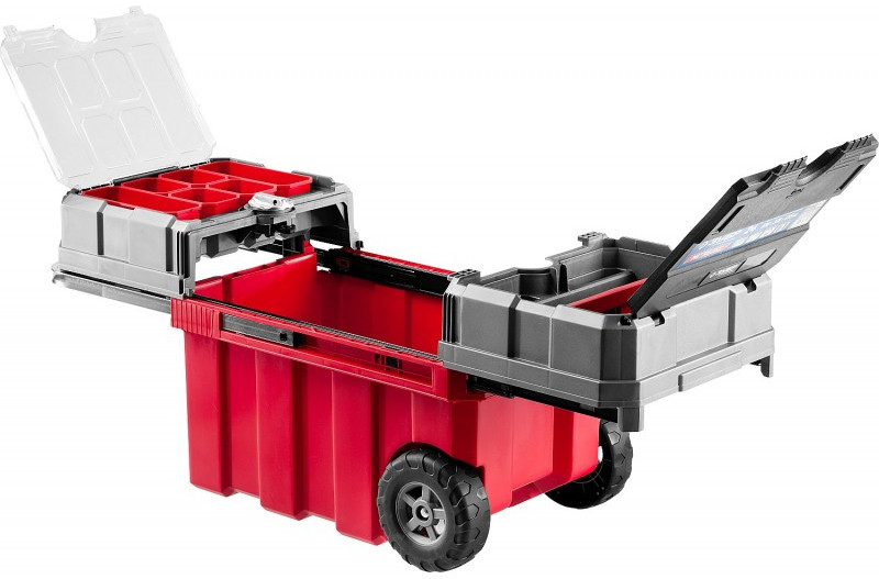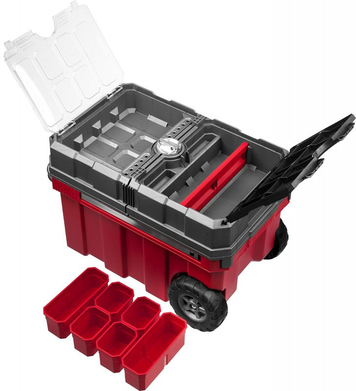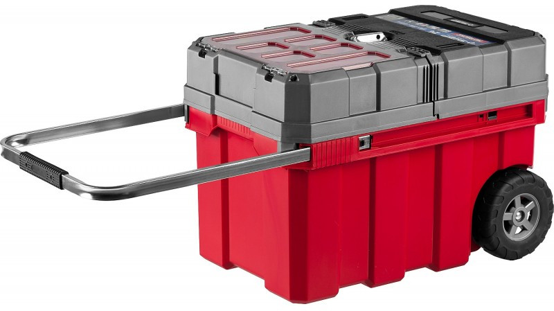- Объем этого ящика позволяет вместить в него большое количество инструментов, удобно разложить их благодаря съемной полке и легко перемещать при помощи встроенных колес и раздвижной ручки.