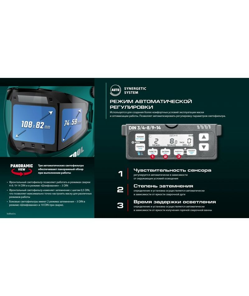 Маска сварщика KRAFTOOL PANZER хамелеон с панорамным трёхсторонним светофильтром, затемнение 3/4-8/9-14 [11061]