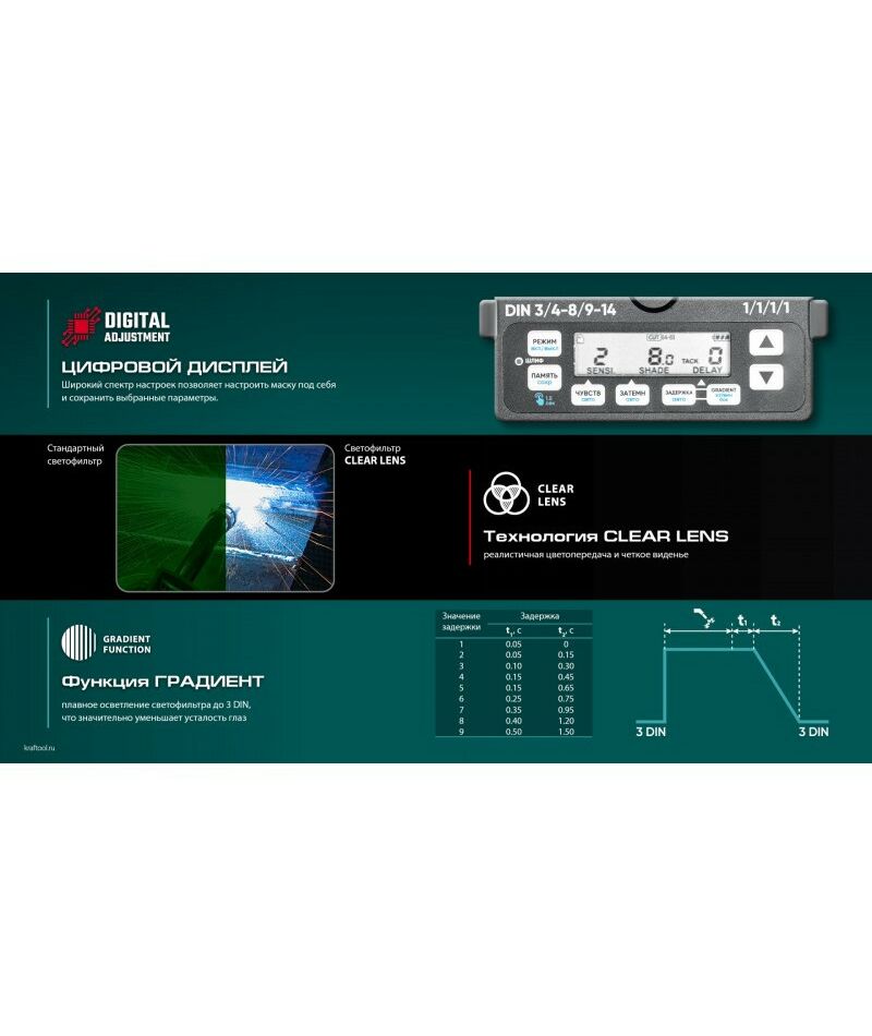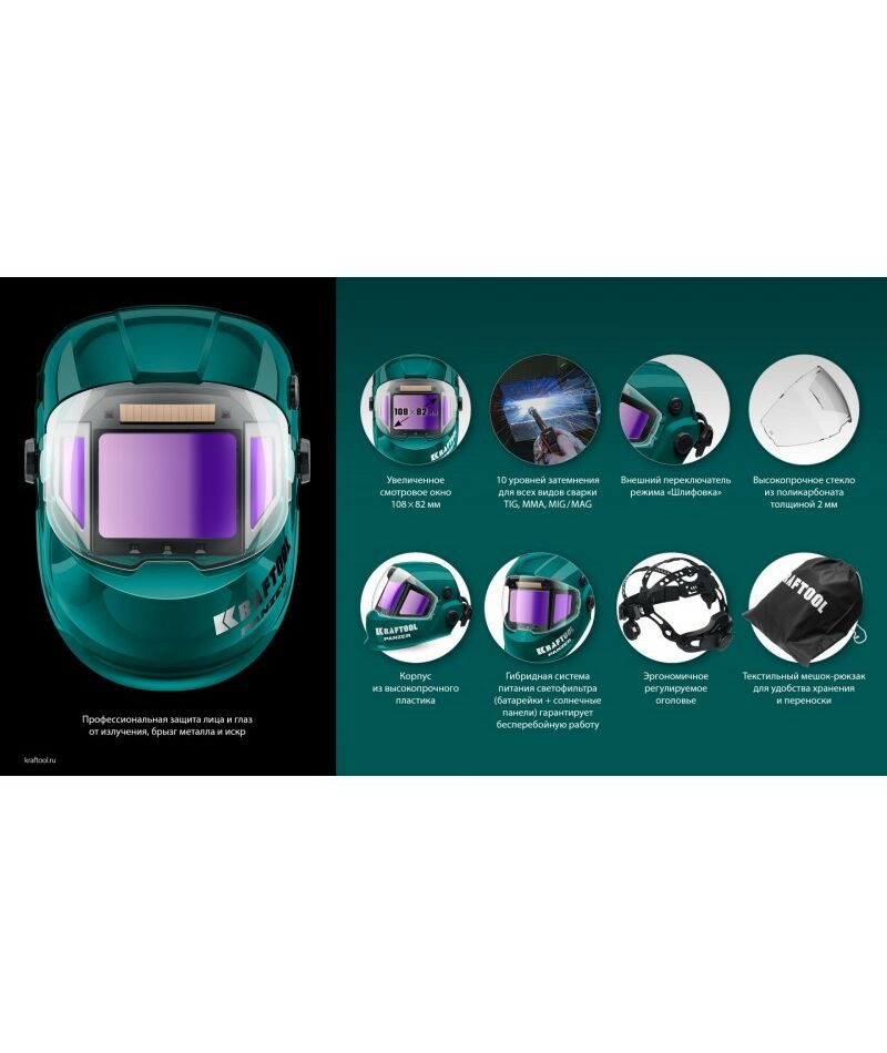 Профессиональная маска сварщика KRAFTOOL для защиты глаз и лица сварщика от прямых излучений сварочной дуги, искр и брызг расплавленного металла, от механических воздействий при выполнении сварочных работ, резки и пайки металла.