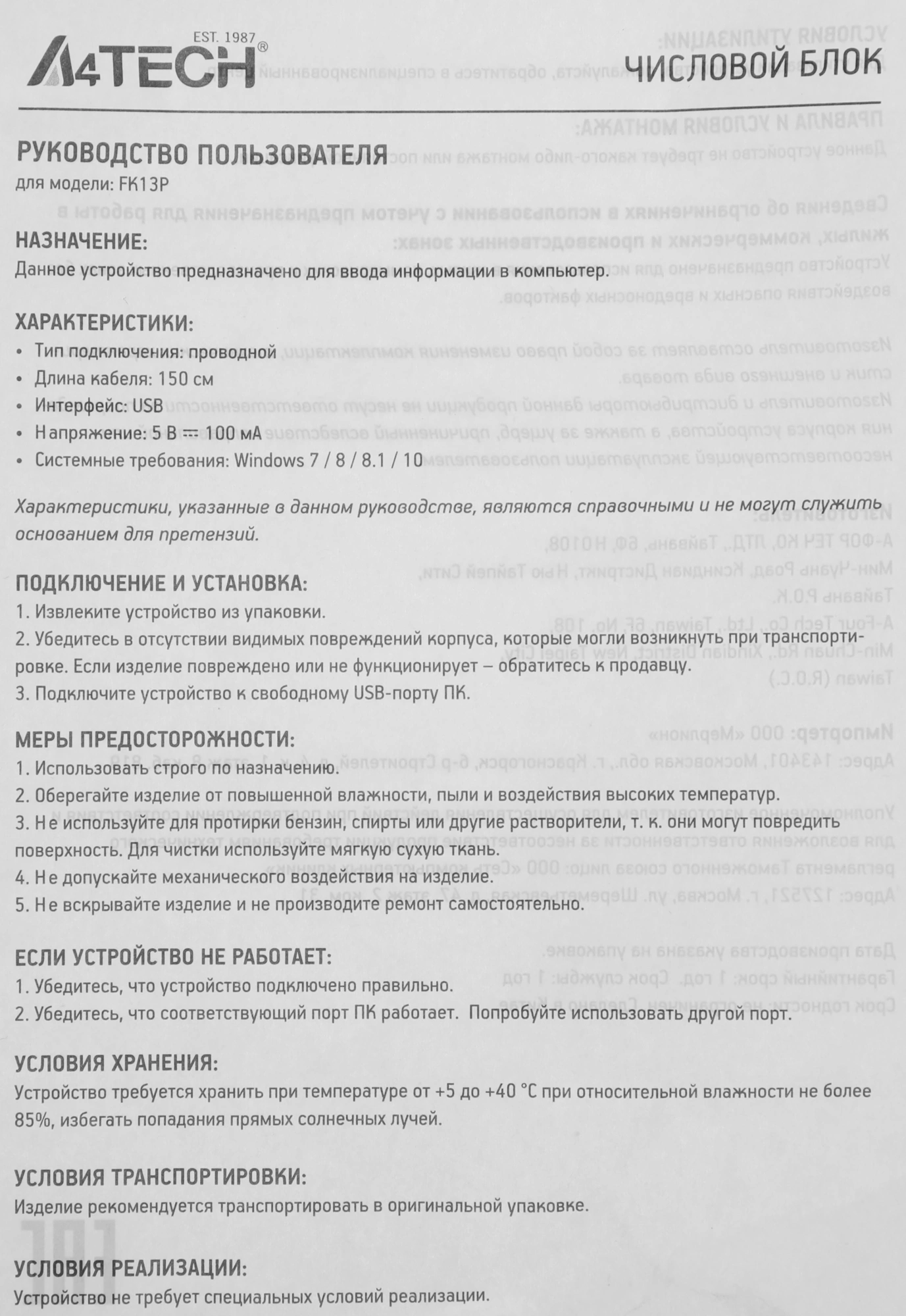 Наличие товара A4-Tech Fstyler FK13P BLACK