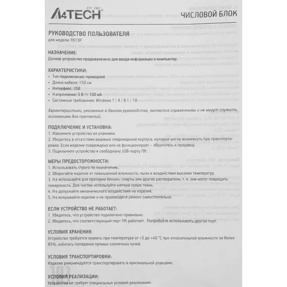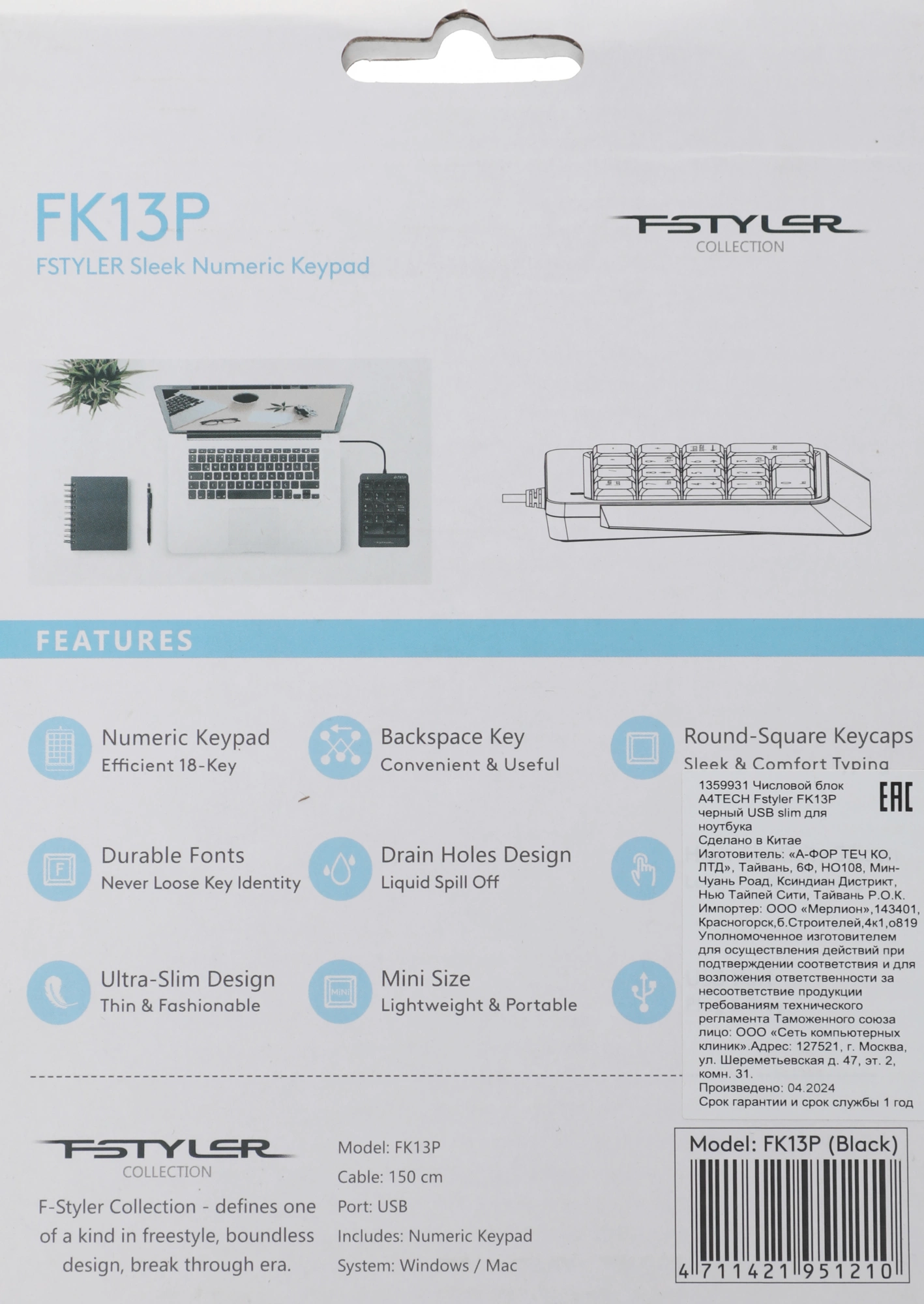 Числовой блок A4-Tech Fstyler FK13P BLACK черный USB slim для ноутбука