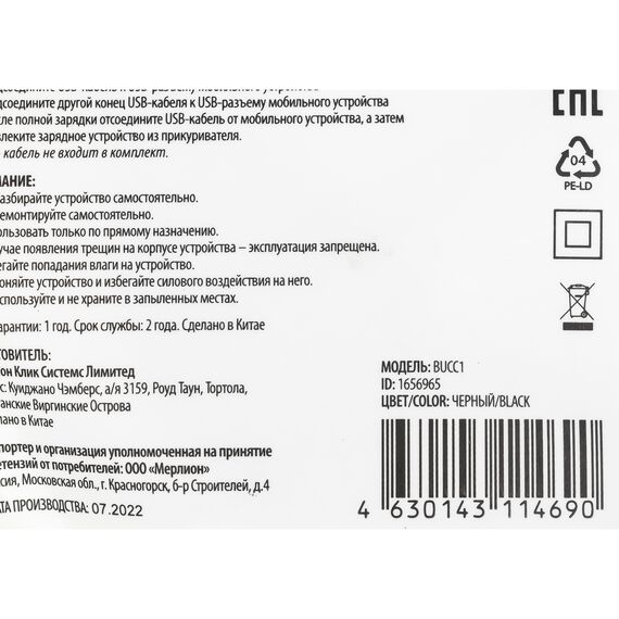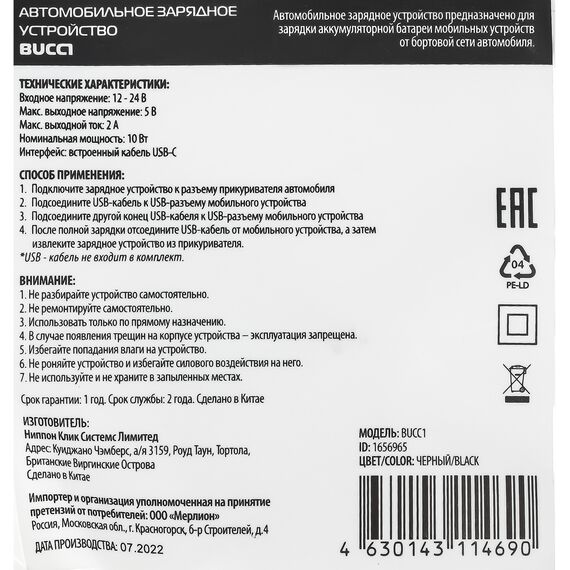 Автомобильное зарядное устройство BURO BUCC1 10W 2A универсальное черный [BUCC10S00CBK]