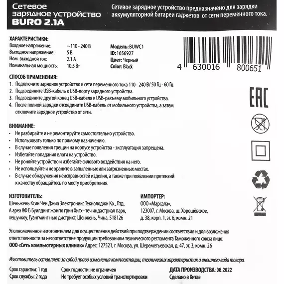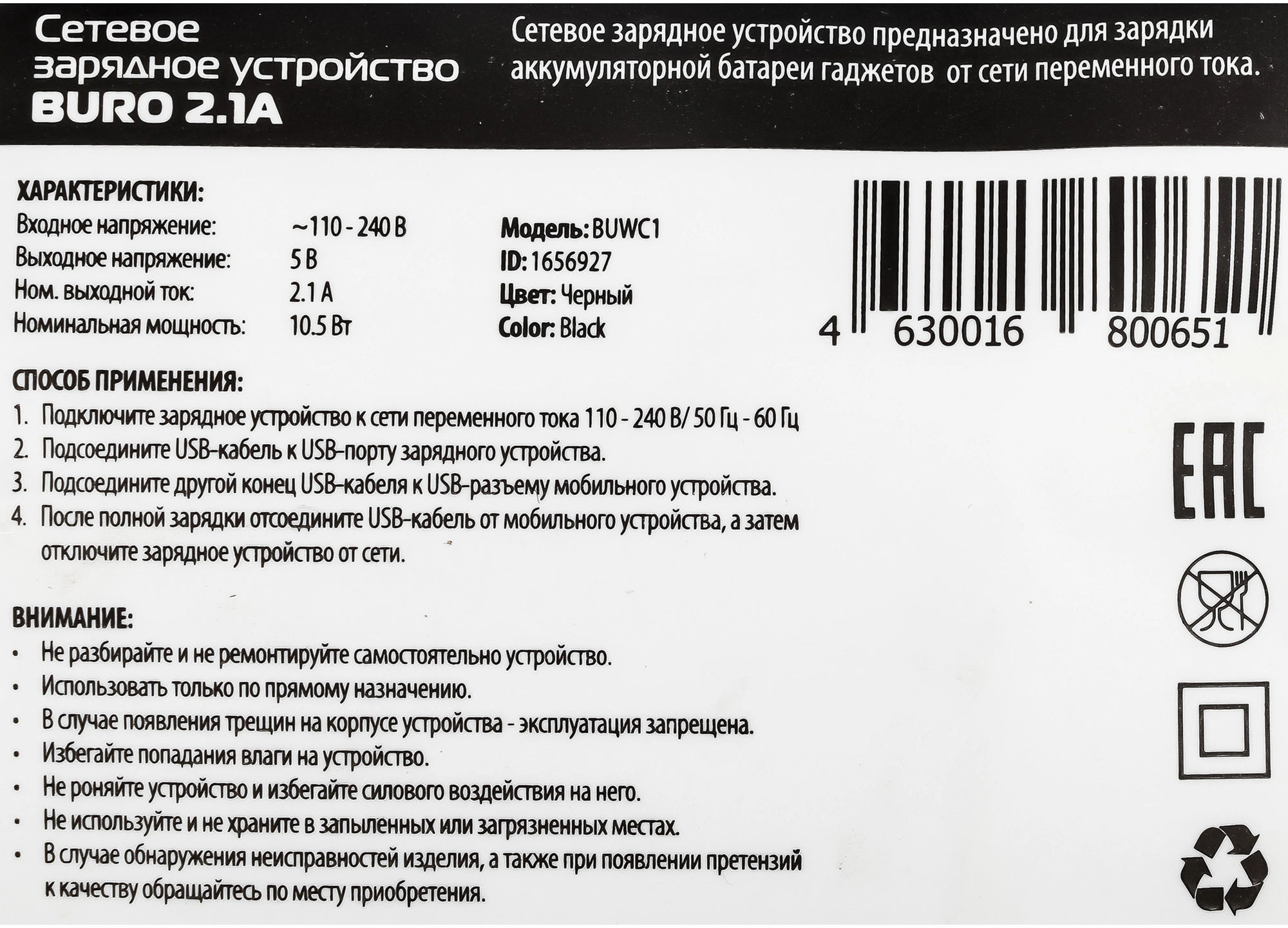Сетевое зар./устр. BURO BUWC1 10W 2A универсальное черный [BUWC10S00CBK]