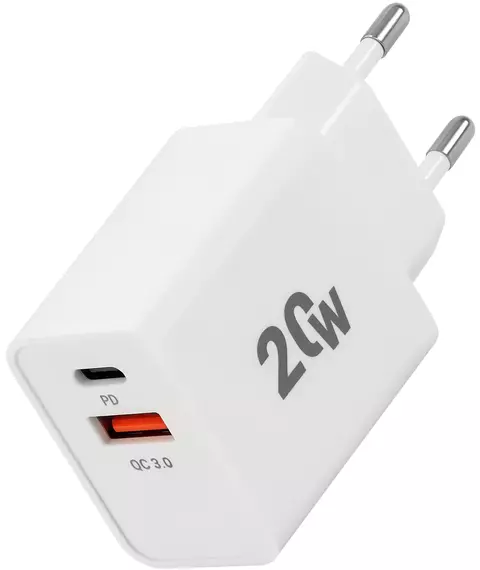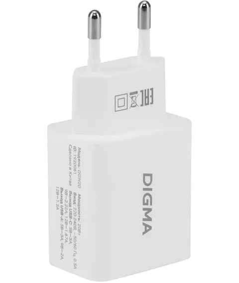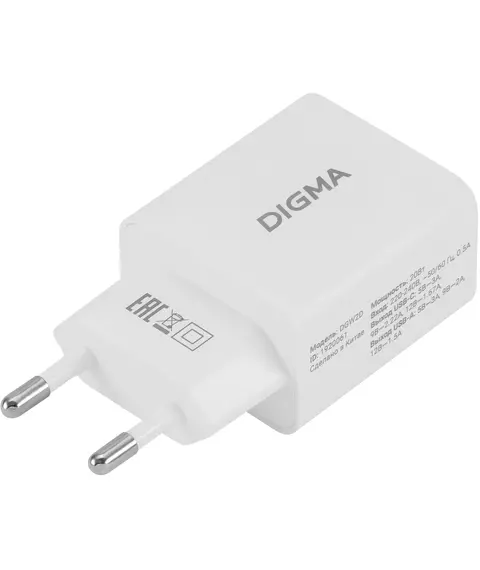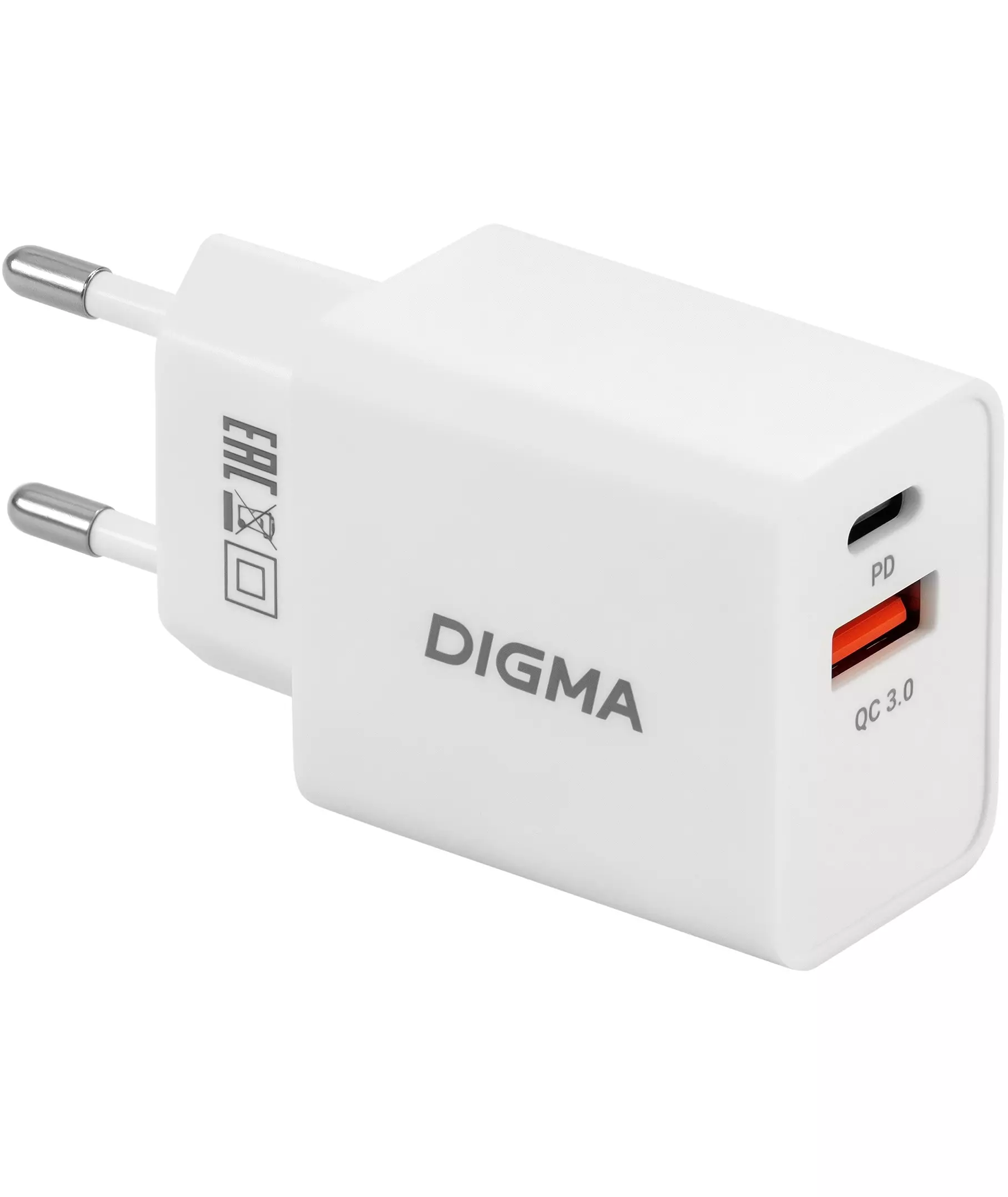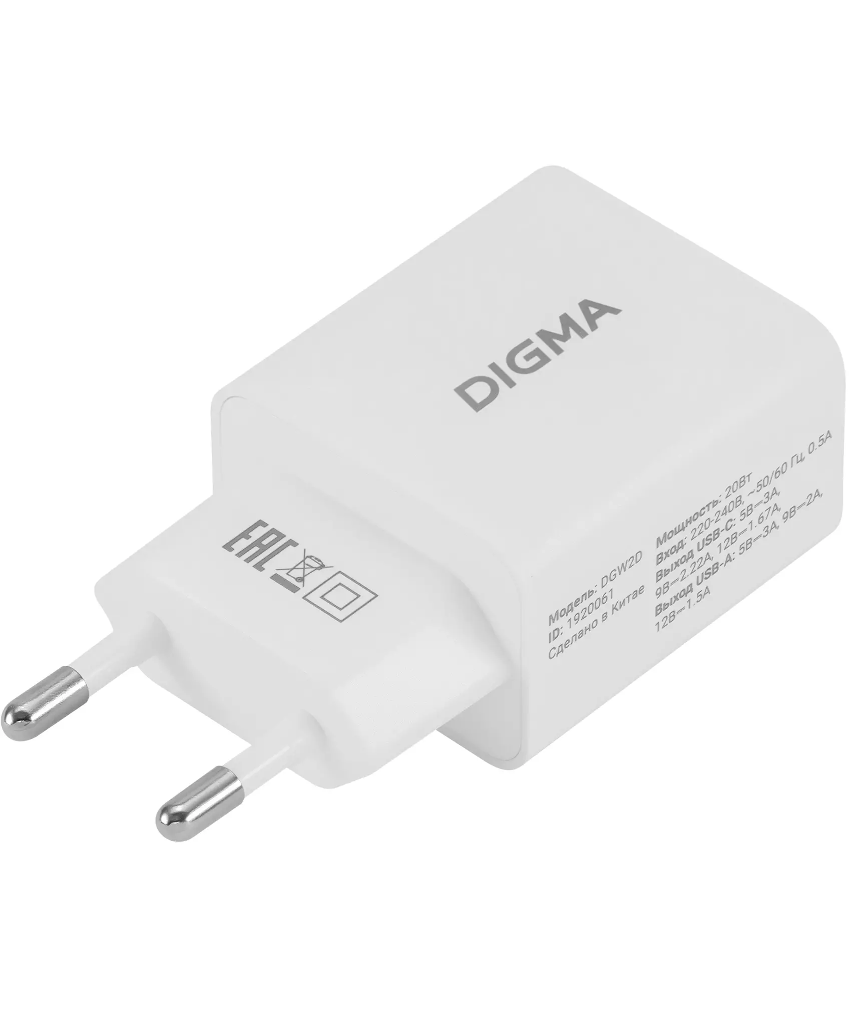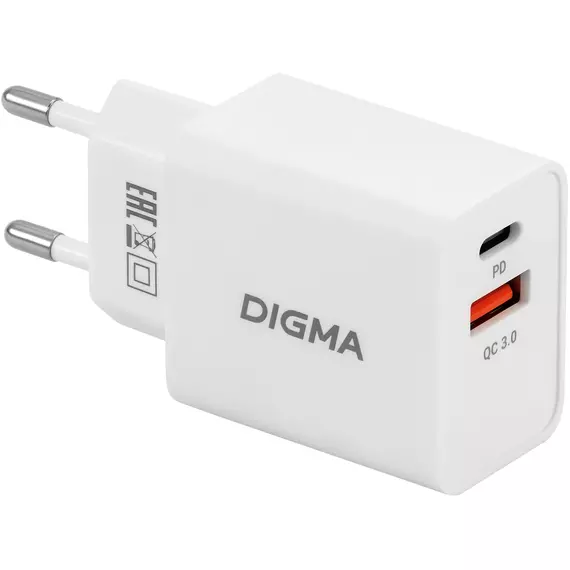 Сетевое зар./устр. Digma DGW2D 20W 3A+1A (PD+QC) USB-C/USB-A универсальное белый [DGW2D0F110WH]
