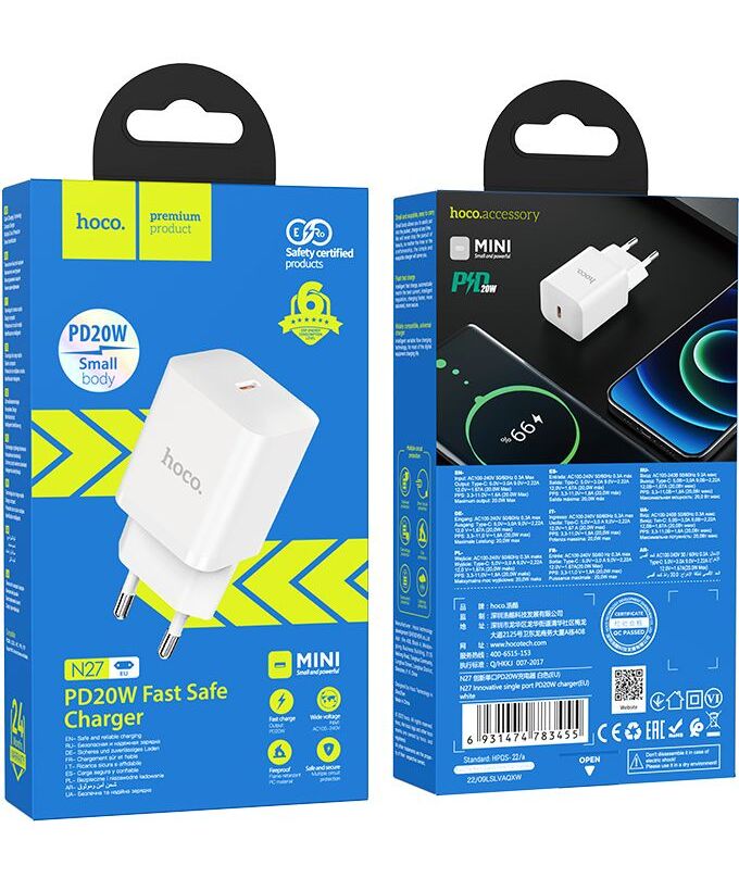Сетевое зар./устр. Hoco N27 20W 3A+2.22A+1.67A (PD+QC+AFC) USB-C универсальное белый
