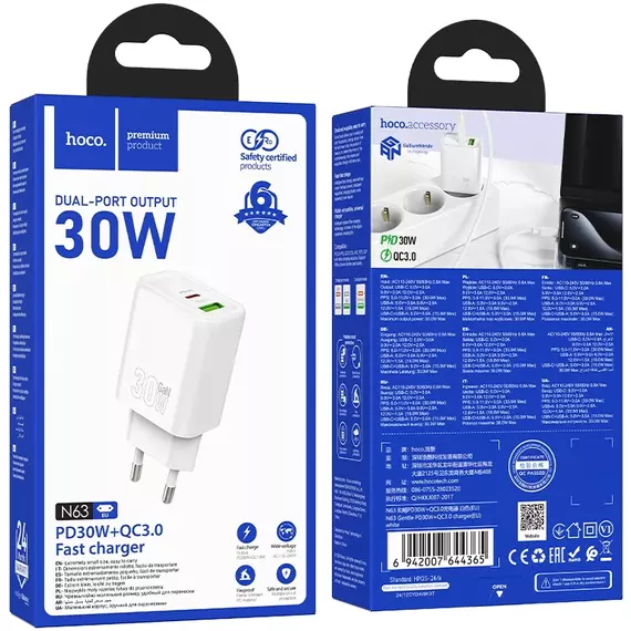 Сетевое зар./устр. Hoco N63 Gentle 30W 3A (PD+QC) USB Type-C универсальное белый