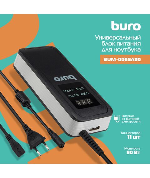Блок питания автоматический BURO BUM-0065A90 90W 15V-20V 11-connectors 5A 1xUSB 2.1A от бытовой электросети LСD индикатор