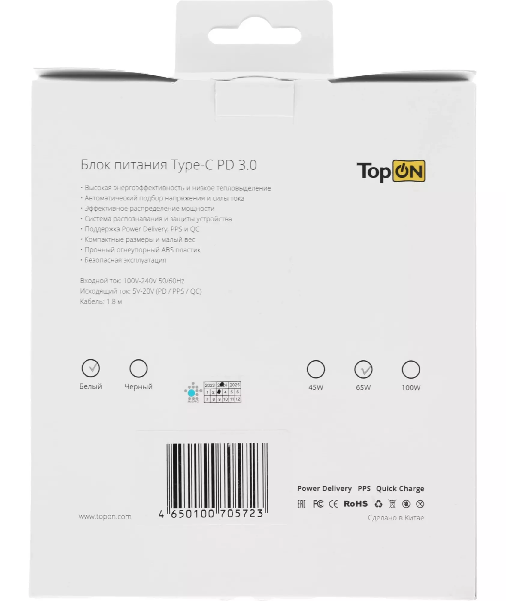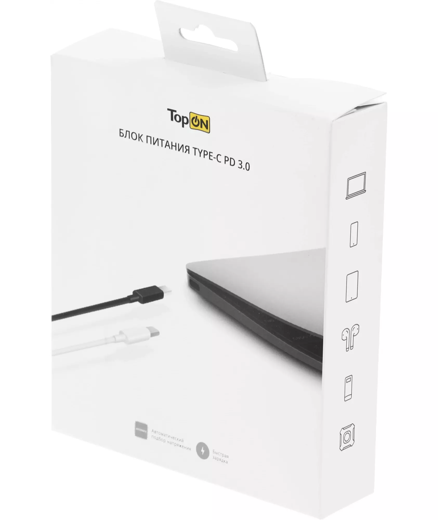 Блок питания TopON для ноутбука ASUS TOP-AS65QW 65W c кабелем Type-C, PowerDelivery 3.0. Подходит для зарядки ноутбуков Asus и других устройств через универсальный порт USB-C. Исходящий ток: 5V~3A, 9~3A, 12V~3A, 15V~3A, 20V~3.25A. Автоматический подбор напряжения и силы тока. Прочный ABS пластик.