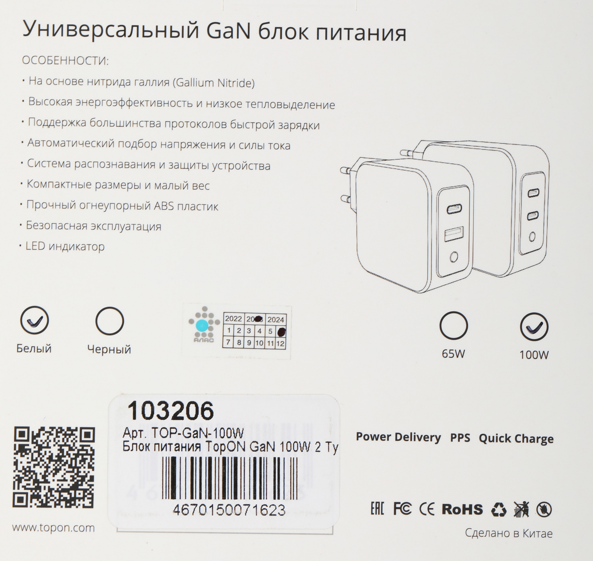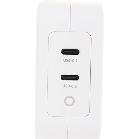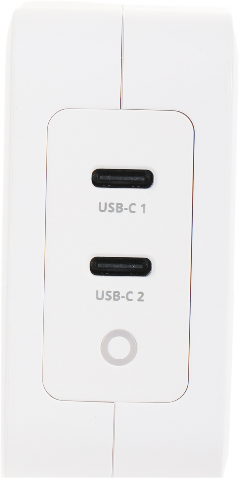 | Особенности | Зарядный кабель продаётся отдельно. 2 универсальных USB-C, LED индикатор. На основе нитрида галлия (Gallium Nitride, GaN). Высокая энергоэффективность, низкое тепловыделение, автоматический подбор напряжения и силы тока. Поддержка Power Delivery 3.1, PPS и QC 4.0. |