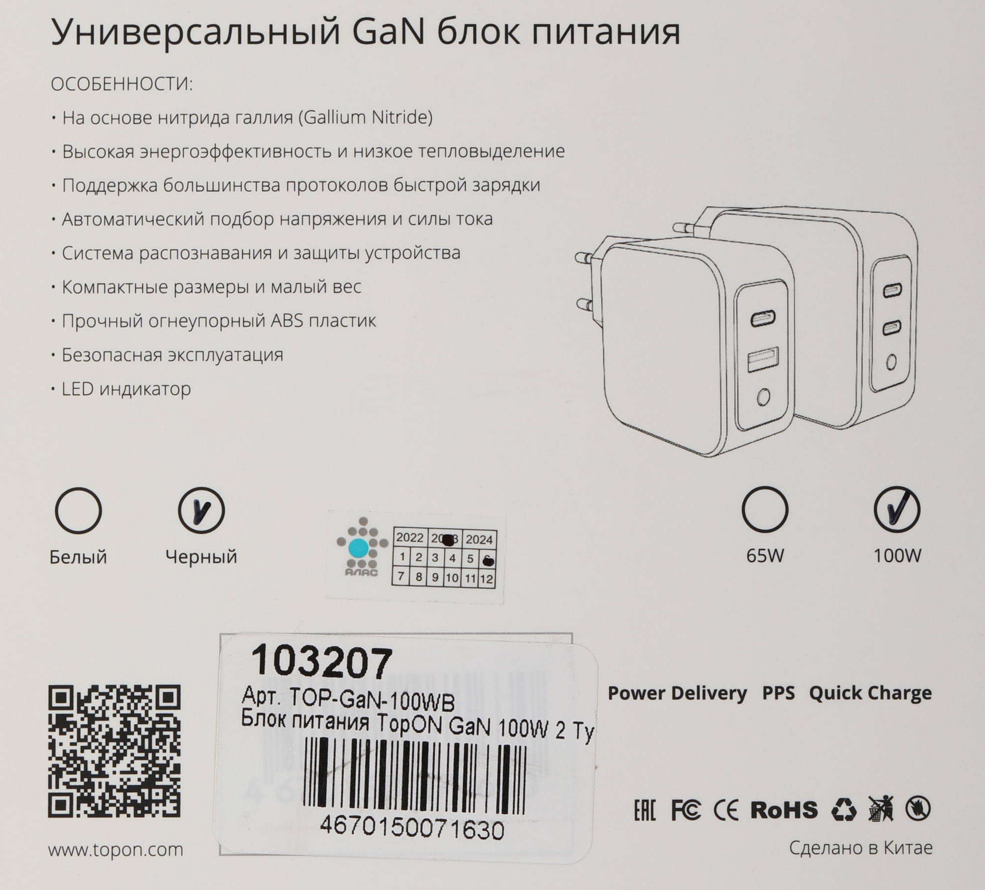 | Особенности | Зарядный кабель продаётся отдельно. 2 универсальных USB-C, LED индикатор. На основе нитрида галлия (Gallium Nitride, GaN). Высокая энергоэффективность, низкое тепловыделение, автоматический подбор напряжения и силы тока. Поддержка Power Delivery 3.1, PPS и QC 4.0. |