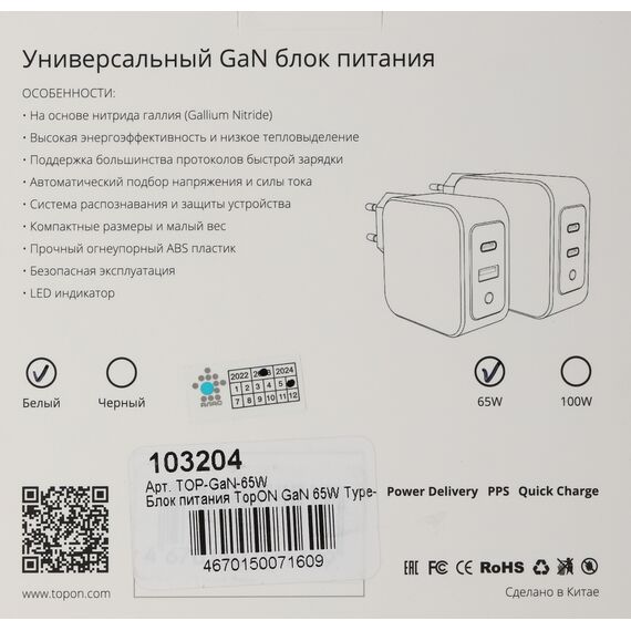 - На основе нитрида галлия (Gallium Nitride, GaN) - Высокая энергоэффективность и низкое тепловыделение - Автоматический подбор напряжения и силы тока - Система распознавания и защиты устройства - Поддержка Power Delivery 3.1, PPS и QC 4.0