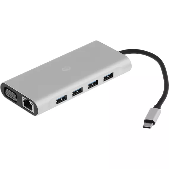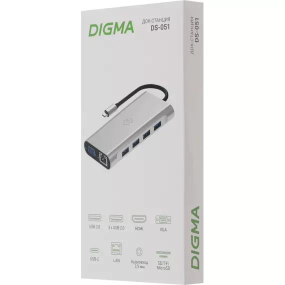 Type-C док-станция Digma, 11 портов (HDMI (4K@30Hz, FULL HD@60Hz) , VGA FULLHD@60Hz, USB-C PD 87W, SD/MicroSD, Lan 100mb, 3.5mm audio, 1xUSB 3.0, 3xUSB 2.0