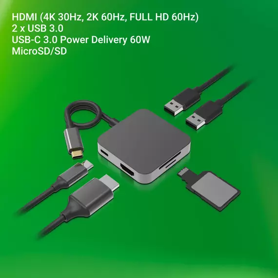 | Особенности | HDMI (4K@30HZ, FULL HD@60Hz). Поддержка карт памяти microSD и SD. Дополнительный порт USB Type-C с поддержкой PowerDelivery 3.0 60Вт. Длина кабеля - 15 см. Не требует дополнительного питания |