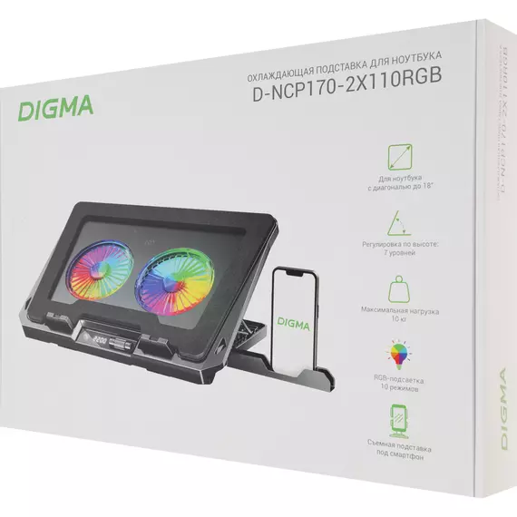 Охлаждающая подставка D-NCP170-2x110RGB оснащена двумя вентиляторами, скорость которых можно настраивать вручную для оптимального охлаждения и снижения шума. Возможность регулировки угла наклона в 7 положениях. 10 режимов подсветки с возможностью отключения вне зависимости от работы вентиляторов.