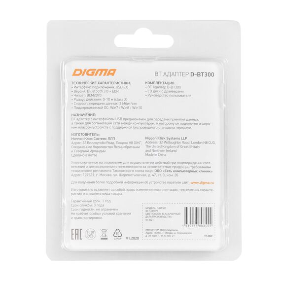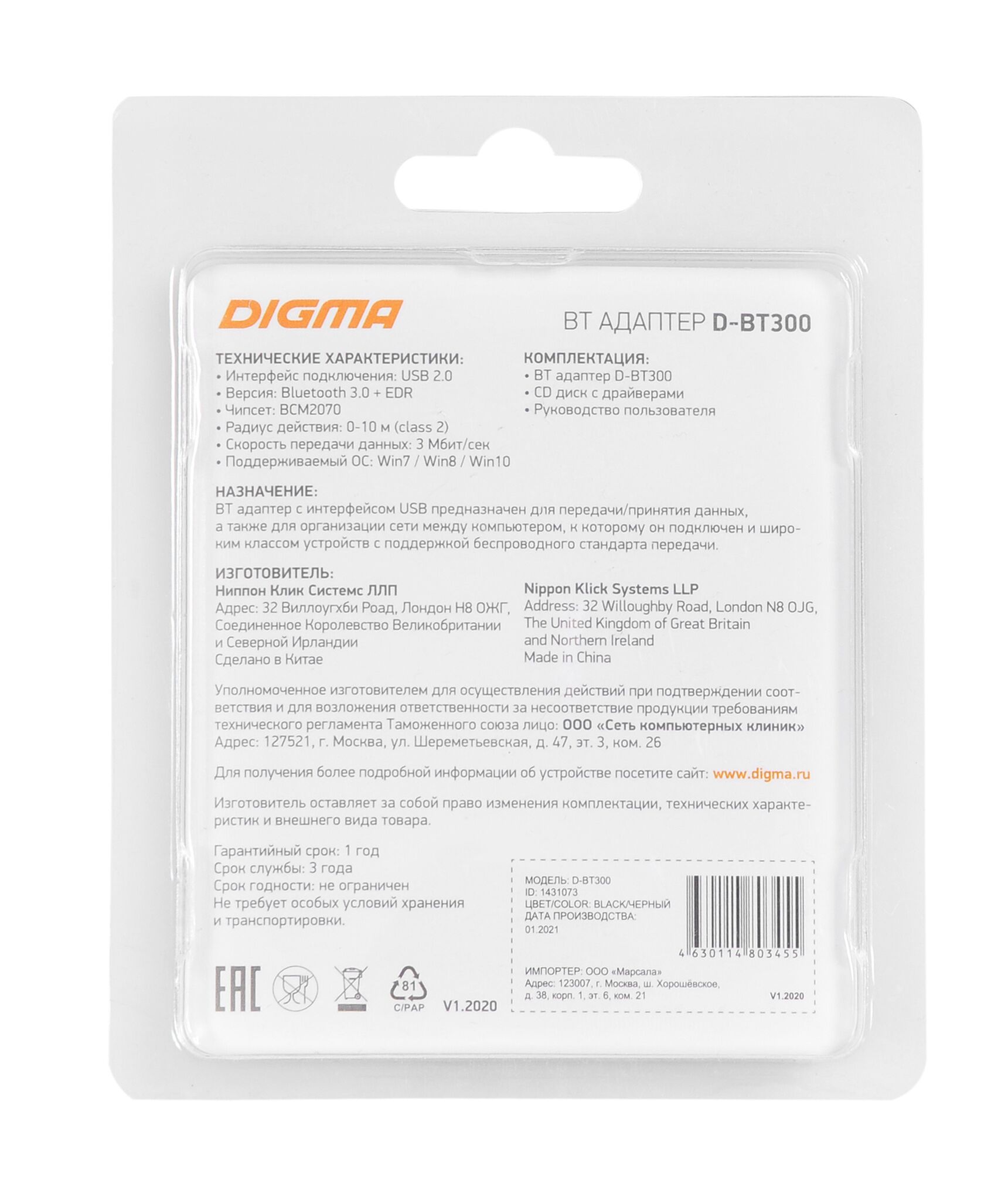 Адаптер USB Digma D-BT300 BT3.0+EDR class 2 10м черный