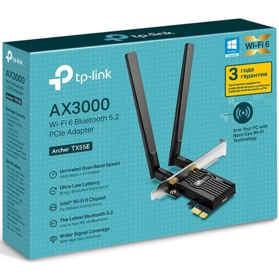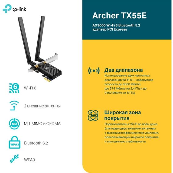 Сетевой адаптер Wi-Fi + Bluetooth TP-Link Archer TX55E AX3000 PCI Express (ант.внеш.съем) 2 ант.