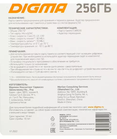 Описание Digma 256GB CARD30 V30 [DGFCA256A03]