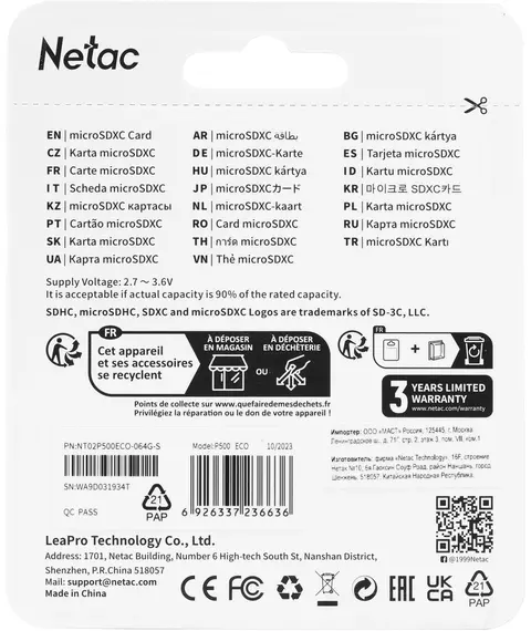 Флеш карта microSDXC Netac 64GB P500 Eco [NT02P500ECO-064G-S]
