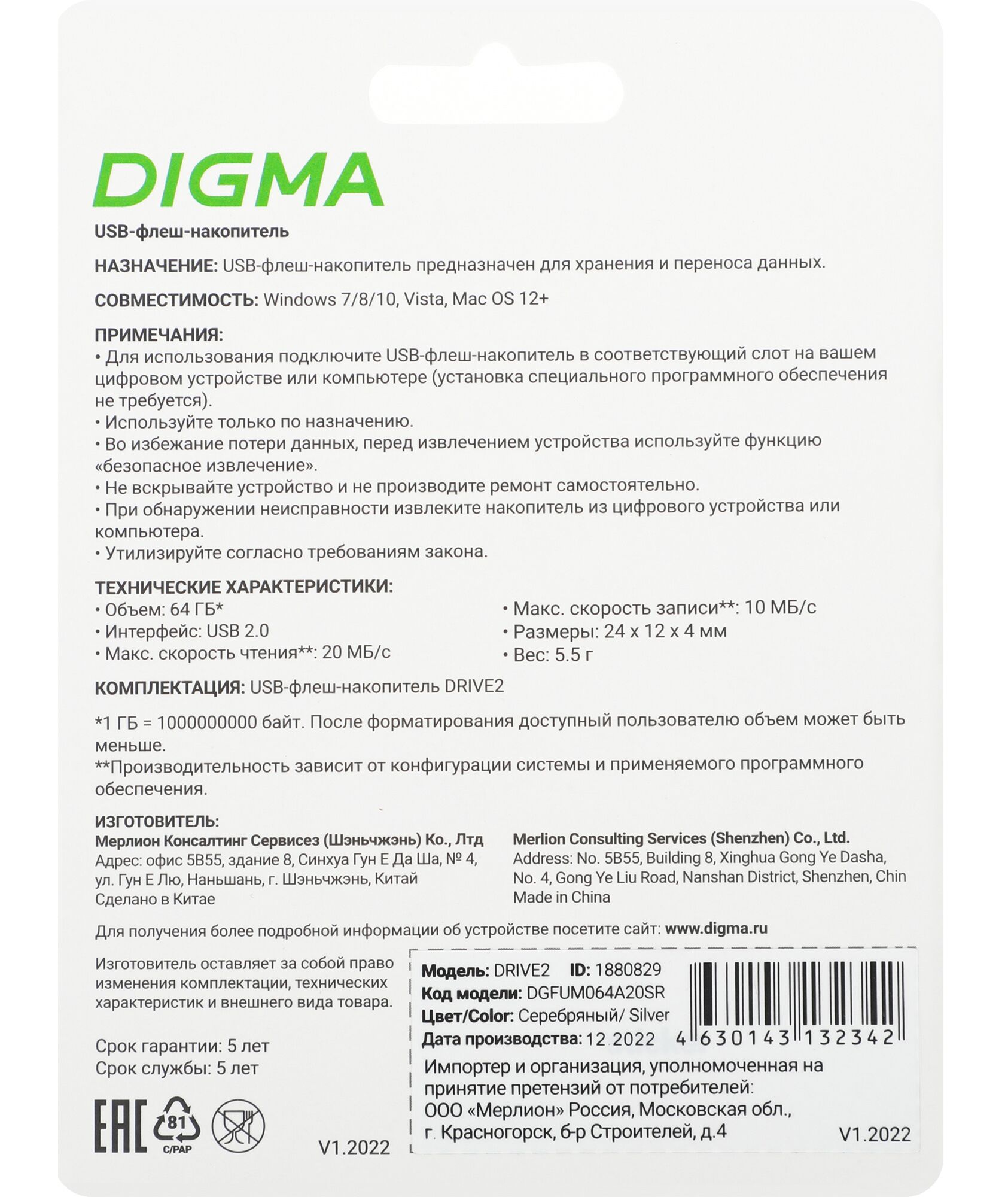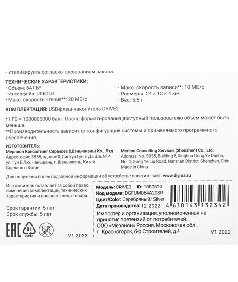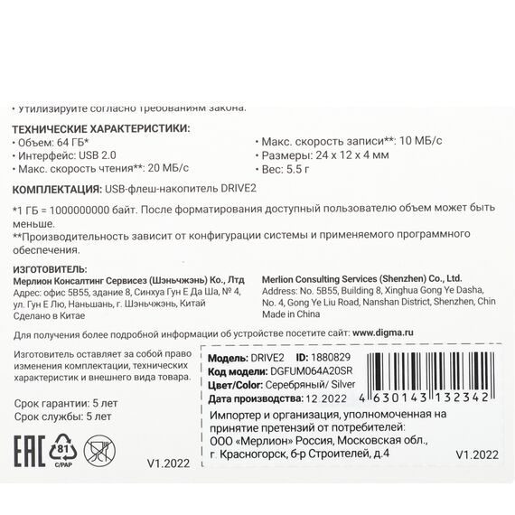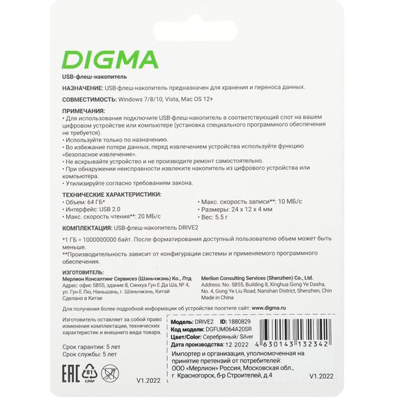 Описание Digma DRIVE2 64Gb [DGFUM064A20SR]