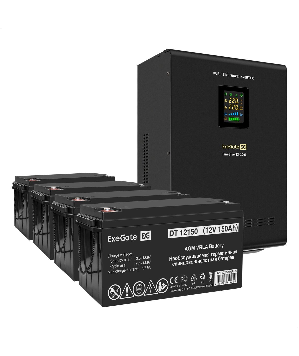 Комплект ИБП Exegate FineSine SX-3000/4 x DT 12150 3000VA/2100W, чистая синусоида, цветной LCD-дисплей, AVR, 2*Schuko+клеммы, линейно-интерактивный, крепление настенное, ИБП EX296003RUS + батарея 150Aч EX282990RUS 4шт [EX296651RUS]