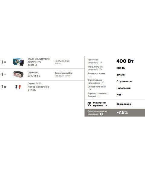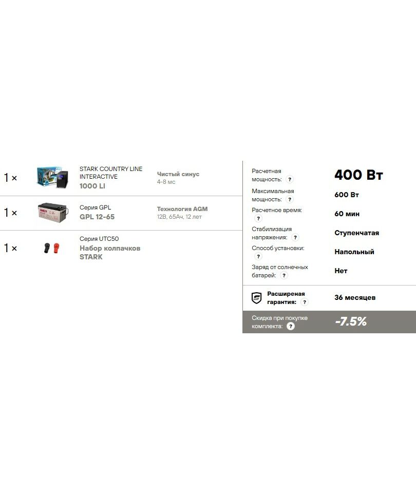Комплект ИБП Stark Country 1000 LI нагрузка 400Вт, автономия 1 час