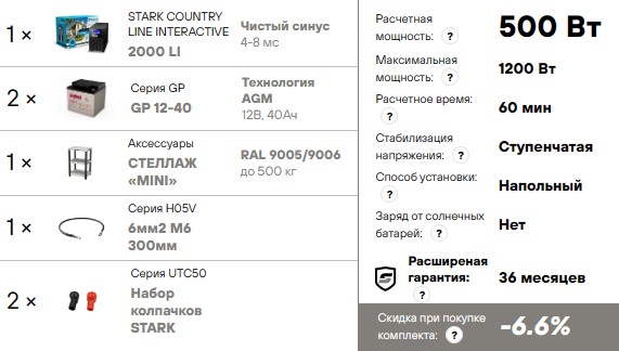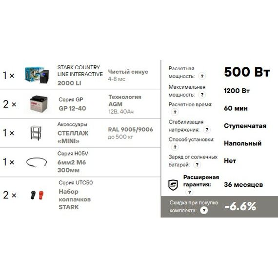 Комплект ИБП Stark Country 2000 LI нагрузка 500Вт, автономия 1 час, стеллаж