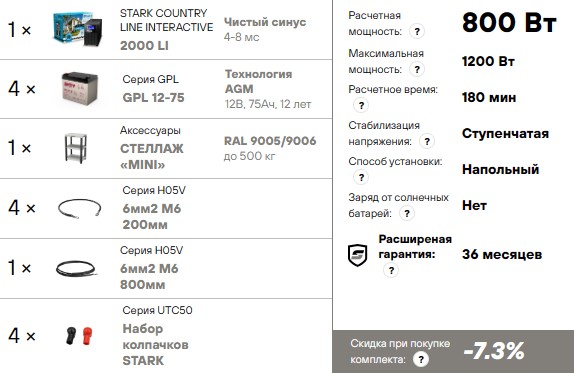 Комплект системы бесперебойного питания Stark Country 2000 LI нагрузка 800Вт, автономия 3 часа, стеллаж