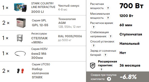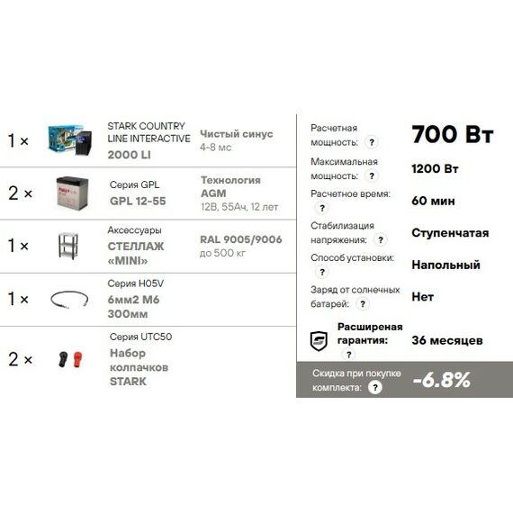 Комплект системы бесперебойного питания Stark Country 2000 LI нагрузка 700Вт, автономия 1 час, Стеллаж