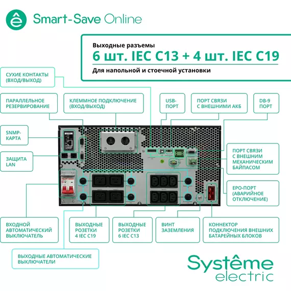 | Выходные розетки типа IEC320 С19, с батарейной поддержкой | 4 |