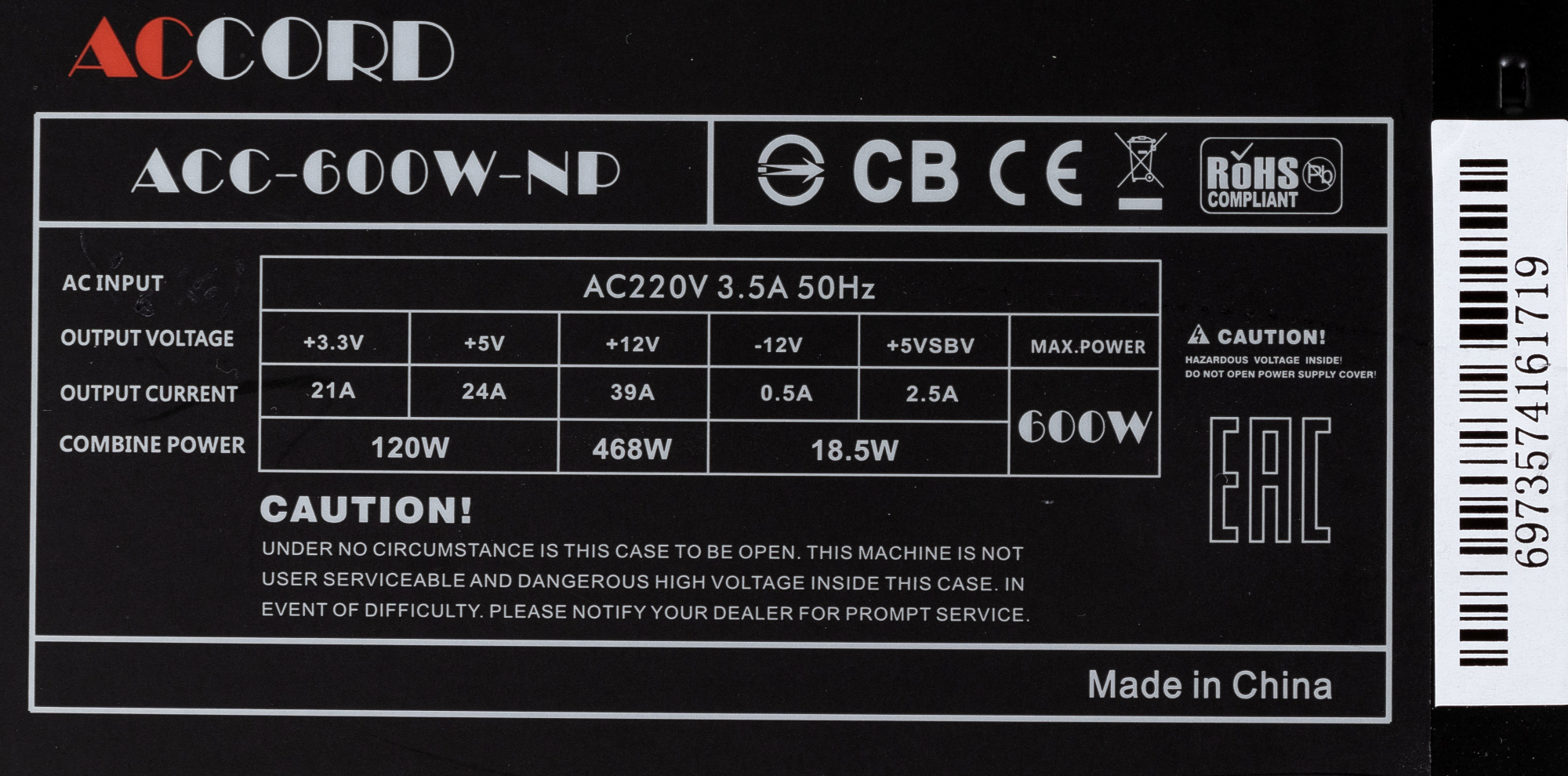 Блок питания Accord ACC-600-NP ATX 600W ACC-600W-NP (20+4pin) 120mm fan 4xSATA