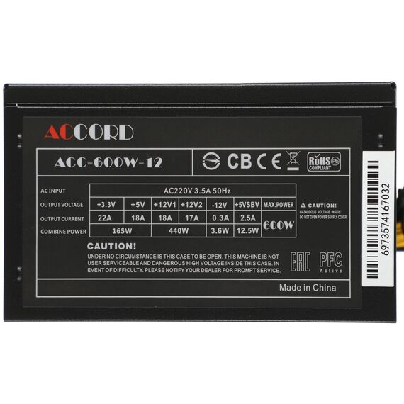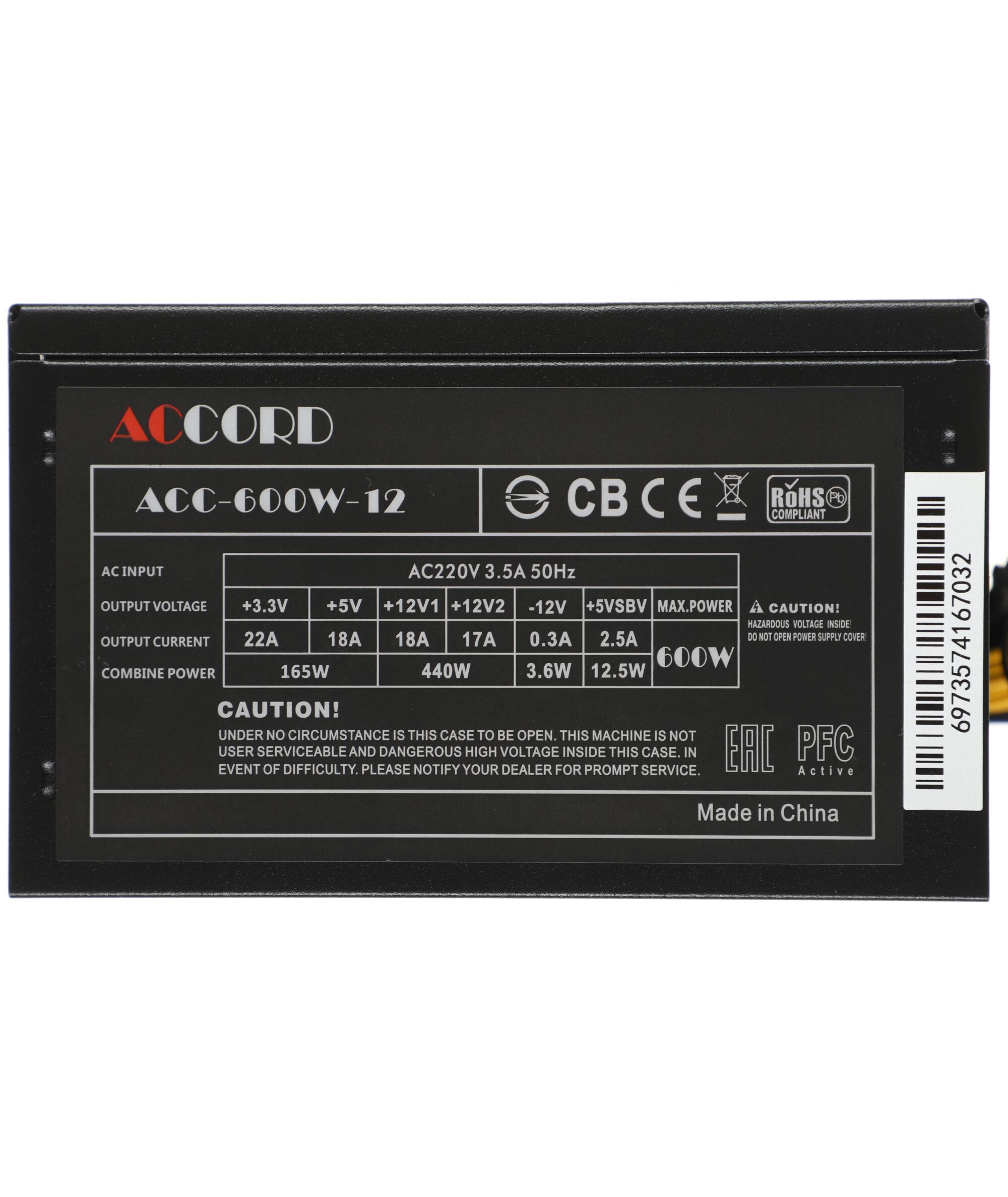 Блок питания Accord ACC-600W-12 ATX 600W (20+4pin) 120mm fan 4xSATA