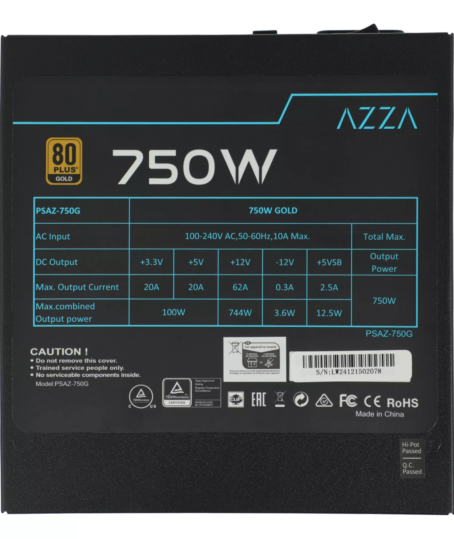 Блок питания Azza PSAZ-750G ATX 750W 80+ gold (20+4pin) APFC 120mm fan 6xSATA Cab Manag RTL