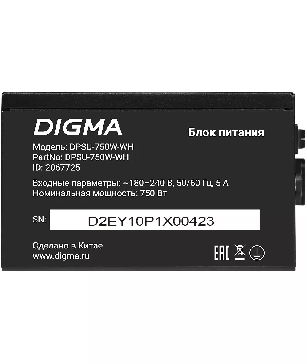 Блок питания Digma DPSU-750W-WH ATX 750W 80 PLUS WHITE (20+4pin) APFC 120mm fan 6xSATA RTL