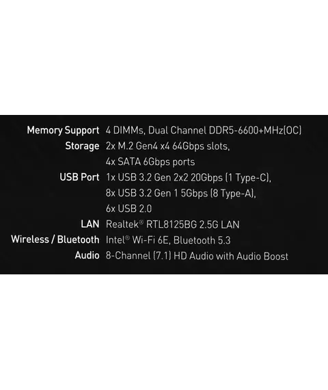 | Поддержка частот оперативной памяти | 6600+(OC)/ 6400(OC)/ 6200(OC)/ 6000(OC)/ 5800(OC)/ 5600(JEDEC)/ 5400(JEDEC)/ 5200(JEDEC)/ 5000(JEDEC)/ 4800 МГц |