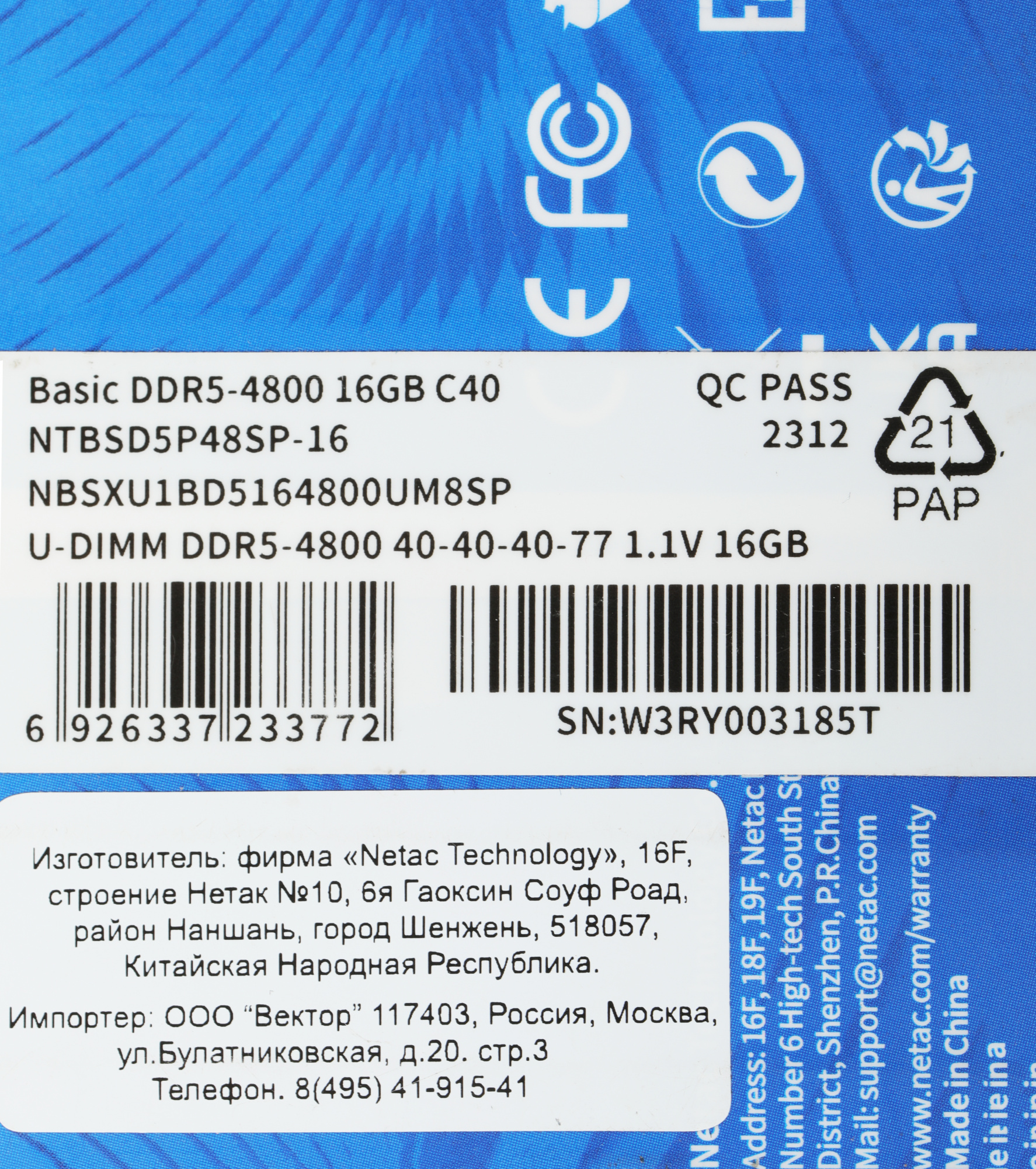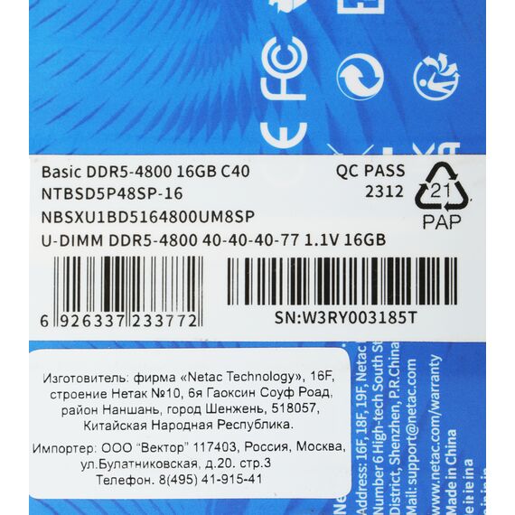 Оперативная память Netac Basic Gaming 16Gb DDR5 4800MHz PC5-38400 CL40 DIMM ECC 288-pin 1.1В RTL [NTBSD5P48SP-16]