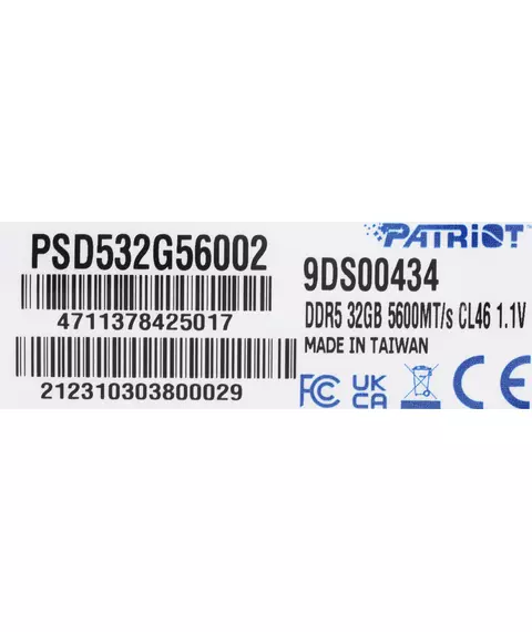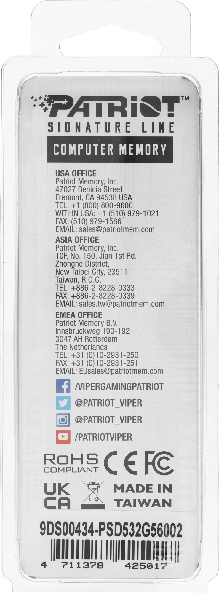 Оперативная память Patriot Signature 32Gb DDR5 5600MHz PC5-44800 CL46 DIMM 288-pin 1.1В dual rank RTL [PSD532G56002]