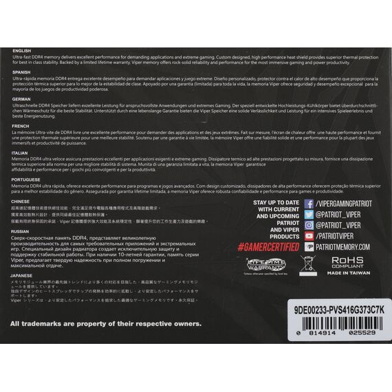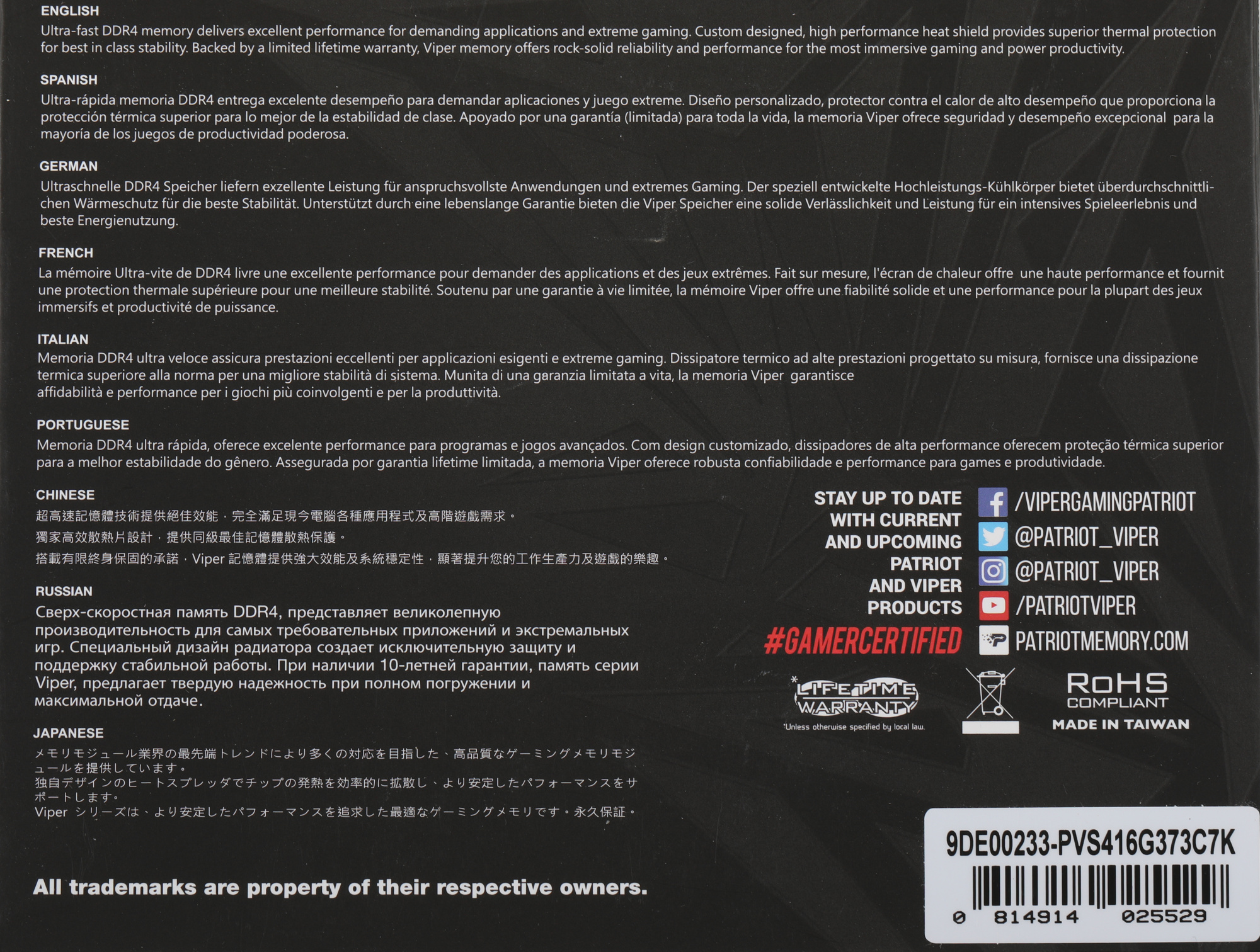 Описание Patriot Viper Steel Gaming 16Gb Kit 2x8Gb [PVS416G373C7K]