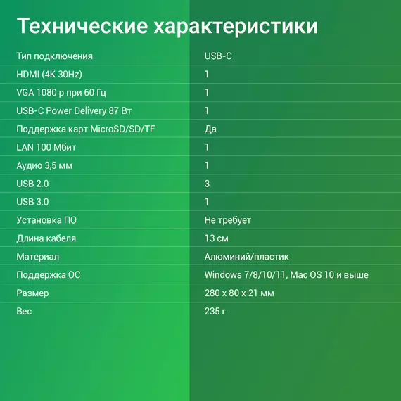 | Особенности | Длина кабеля 13см. Не требует дополнительного питания |
