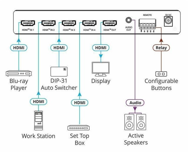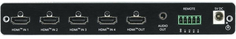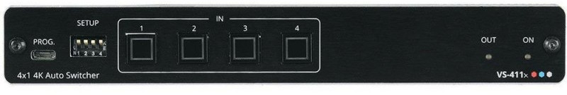 Коммутатор 4х1 сигналов HDMI разрешением до 4K/60 (4:4:4) c поддержкой HDCP 2.2, EDID и CEC, деэмбеддирование аналогового стерео (miniJack 3,5 мм) с автоматическим переключением по наличию сигнала или по заданному приоритету. Управление устройством осуществляется переключателями на задней панели, «сухими» контактами