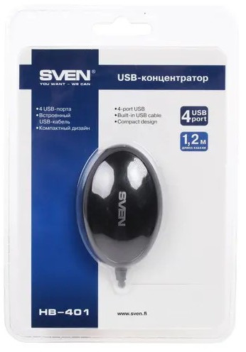 Разветвитель SVEN HB-401 USB 2.0 Type-A x4, кабель 120 см, черный SV-012830