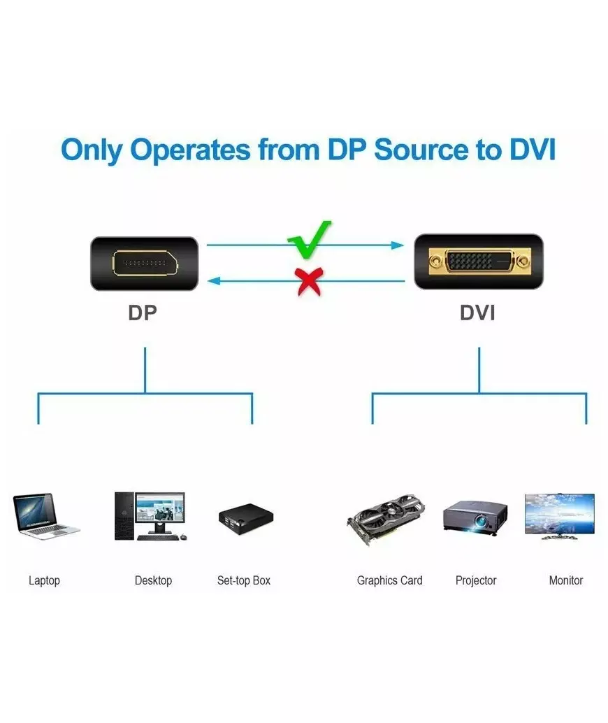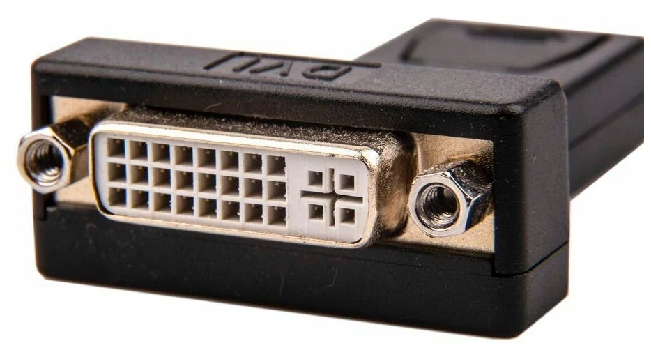 Однонаправленный переходник для подключения монитора или телевизора с интерфейсом DVI к ноутбуку или видеокарте с выходом DisplayPort. Максимальное разрешение 1920 x 1080@60 Hz