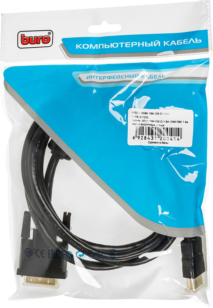 Кабель BURO HDMI (m) DVI-D (m) 1.8м феррит.кольца черный [HDMI-19M-DVI-D-1.8M]