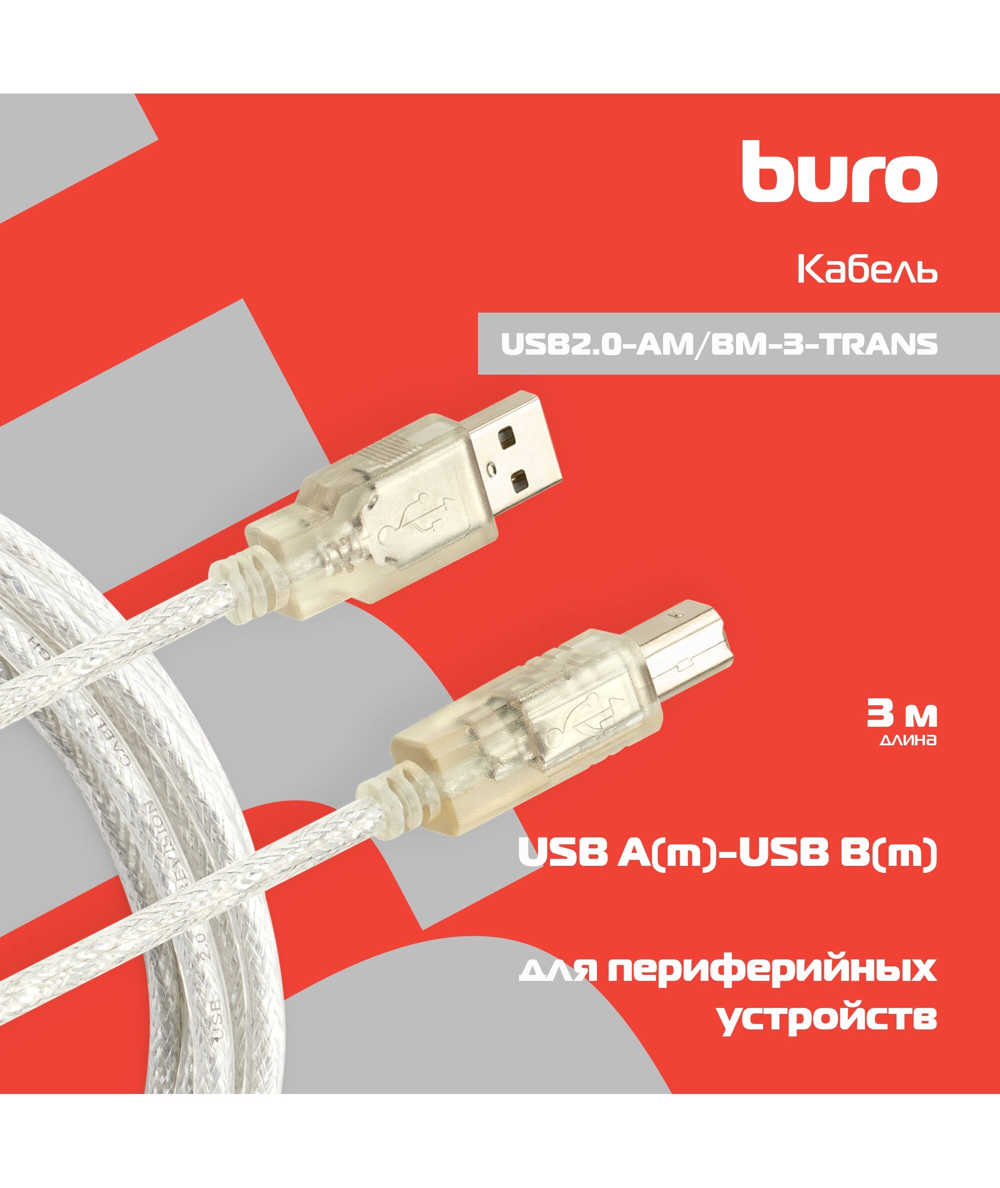 Кабель BURO USB А->B 2.0 3м прозрачный [USB2.0-AM/BM-3-TRANS]
