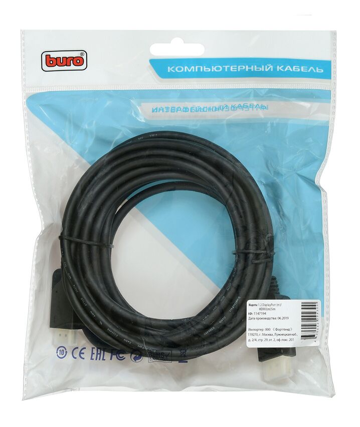 Описание BURO v. 1.2 DisplayPort (m)/HDMI (m) 5м. [BHP DPP_HDMI-5]
