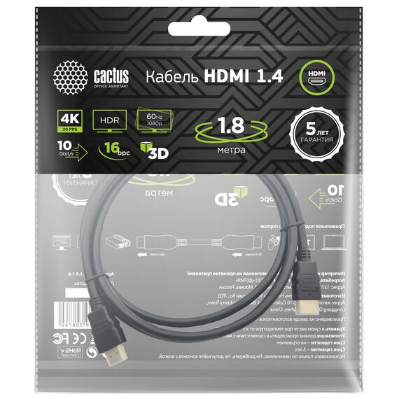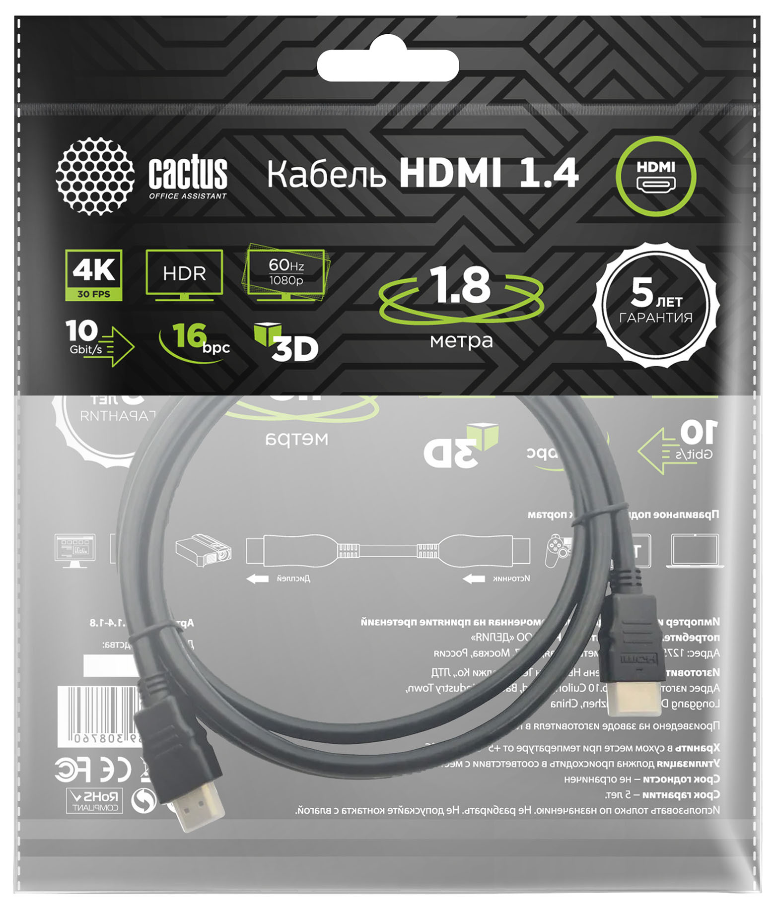 Описание Cactus HDMI (m)/HDMI (m) 1.8м. [CS-HDMI.1.4-1.8]